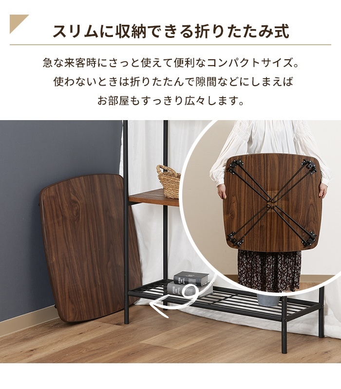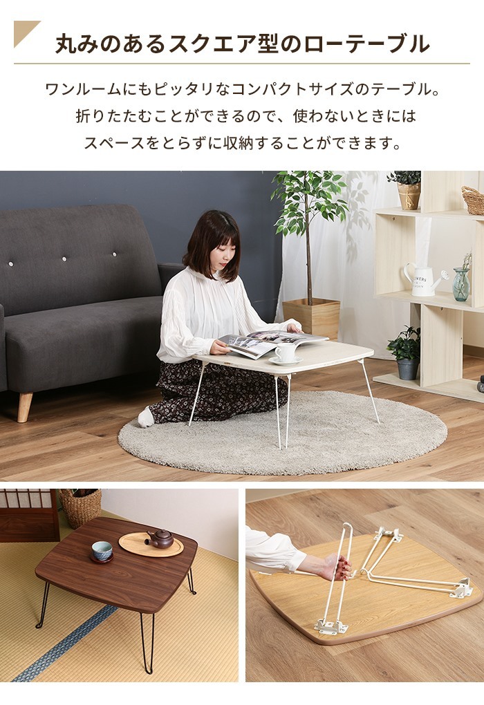 | ワンルームにもピッタリなコンパクトサイズのローテーブル。 折りたたむことができるので、使わないときにはスペースをとらずに収納することができます。 角がまるくなっているので、小さなお子様がいるご家庭でも安心して使用できます。 |