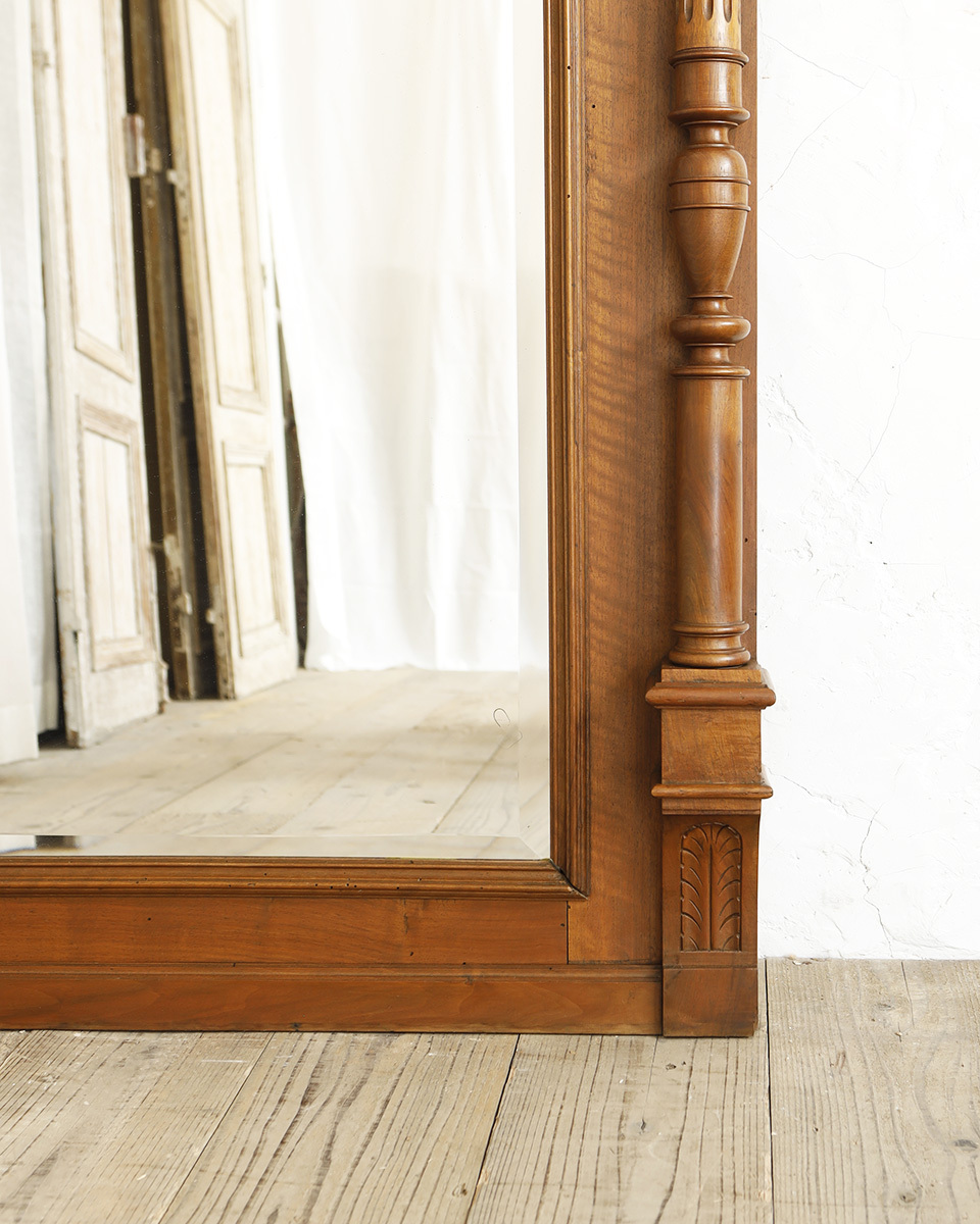 From : France ルイ16世様式の大きなサイズのミラーです。 ルイ16世様式のスタイルならではの、シンメトリーで 直線的なデザインに、美しい彫刻装飾が上品で気品ある佇まい。 また、ナチュラルで明るい色味の木製のフレームが 華美過ぎない温かみのある雰囲気を醸し出しています。 また、ミラー部分には周りを縁取る浮き彫り加工が 施されており、よりエレガントで高貴な印象を与えてくれます。 もともとは壁に取り付けるウォールミラーとしてや、暖炉や サイドボードの上などに飾るミラーとして使われていましたが 床置きにして、全身も映す姿見としてもお使いいただけます。 ミラー面サイズ 64cm×118.5cm ミラー面に銀サビや黒い斑点、小キズや汚れなどがございます。 ミラーとしてのご使用に問題のない程度となっておりますが 恐れ入りますが、予めご了承くださいませ。 全体的にムシクイ跡がございます。 商品はアンティーク品のため、お写真では伝わり難い 色褪せや小傷、汚れなどがございます。 追加のお写真をご希望の方はお気軽にお問合せくださいませ。 |