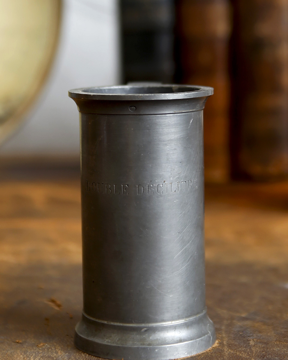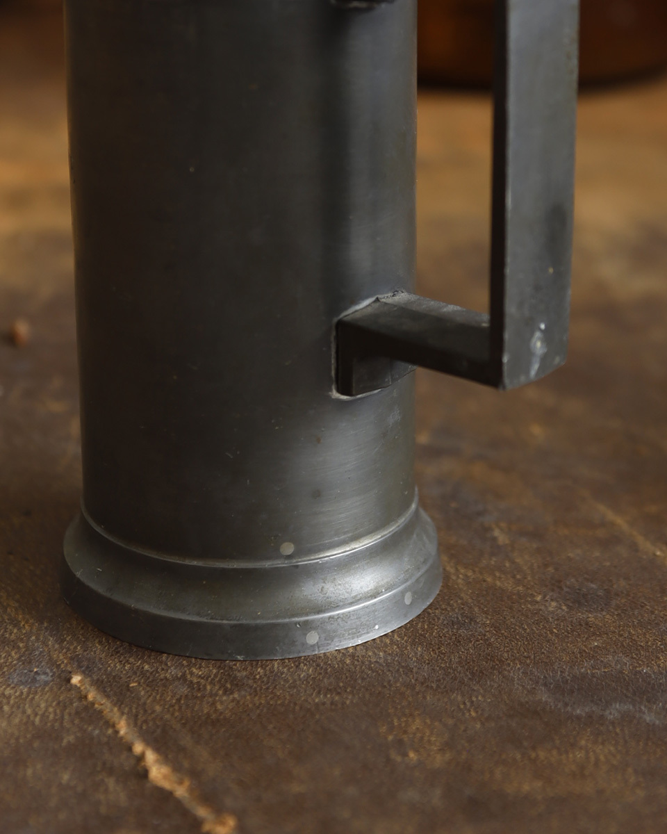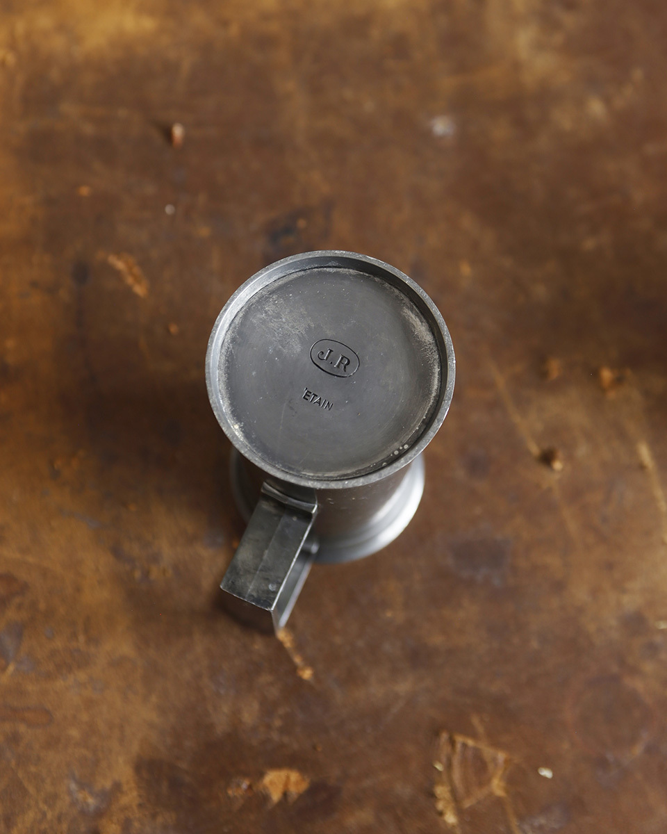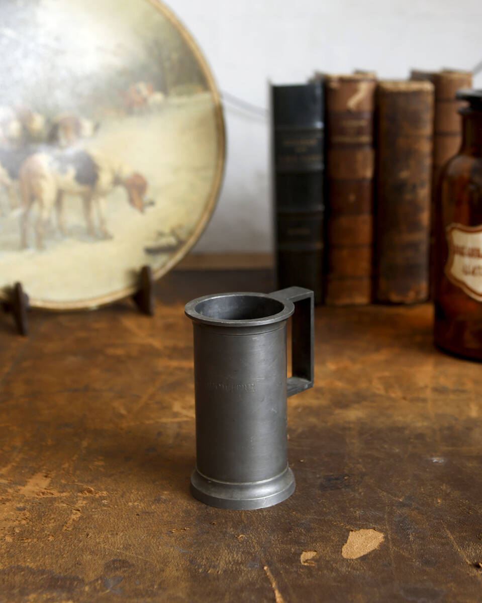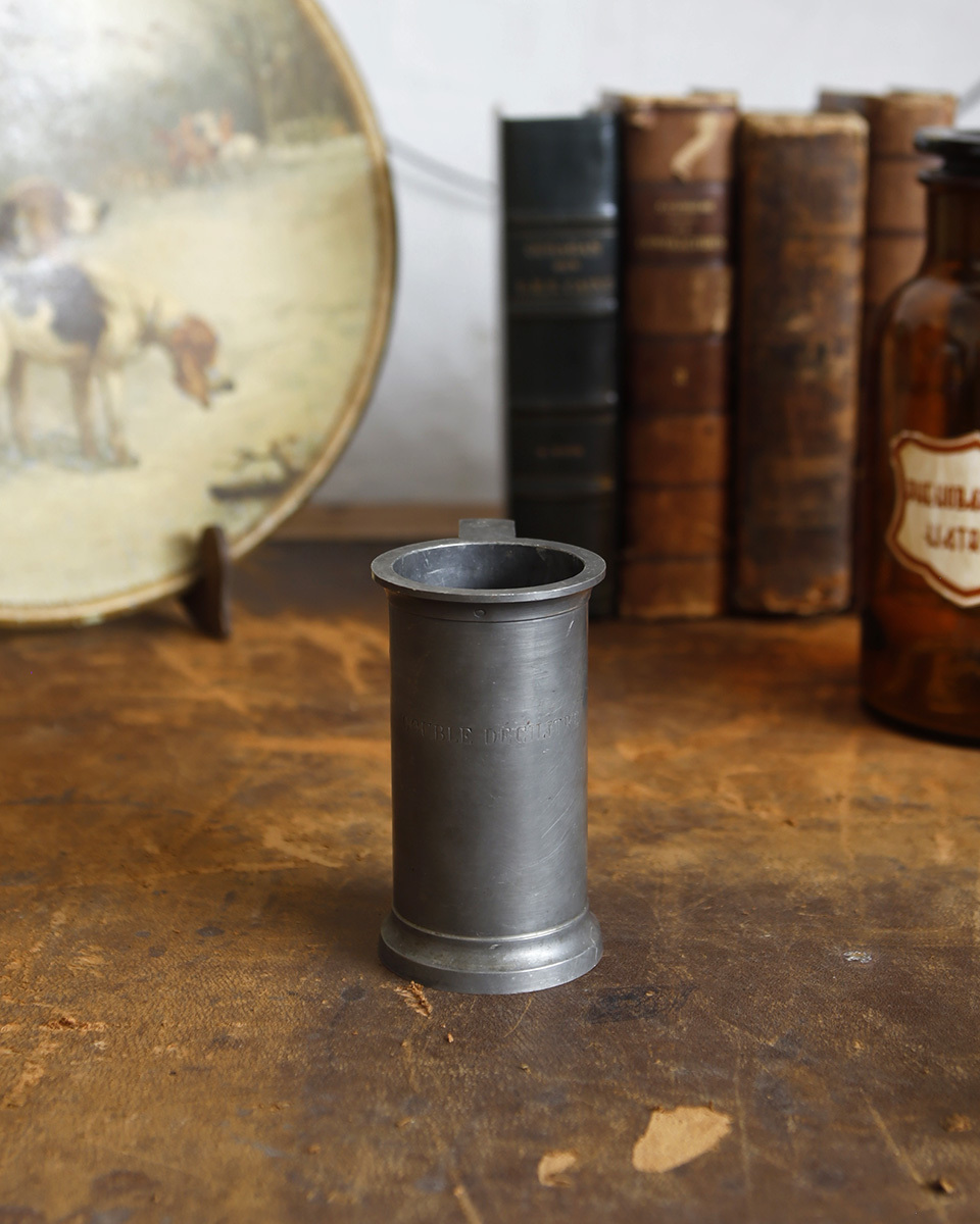 From : France 1887年創業のフランスの老舗メーカー ”JEAN ROUSSEL PARIS”社のピューター製 メジャーカップです。 フランス語でエタン(ETAIN)とも呼ばれるピューターの素材は 中世のヨーロッパでは高価なシルバーの代用品として 庶民の間で広く使われており、薬剤やお酒などを計る 計量カップとして使われていました。 すっきりとしたシルエットにアンティークならではの くすみがかったピューターの独特な風合いが魅力的で また、表面に刻まれた"DOUBLE DECILITRE"(200ml) の文字がスタイリッシュな印象をも感じさせます。 そのままディスプレイするのはもちろん、しっかりと重みも あるので、フラワーベースやペン立て、雑貨小物を収納する 容器としてもお勧めです。 裏には ”J.R" (JEAN ROUSSEL PARIS)の刻印がございます。 実際にお使いいただく際の衛生面での保証はいたしかねますため ディスプレイ品としてのご使用をお勧めしております。 商品はアンティーク品のため、お写真では伝わり 難い色褪せや汚れ、小傷や歪み、錆や凹み跡などがございます。 アンティークならではの風合いとしてお楽しみくださいませ。 また、追加のお写真をご希望の方はお気軽にお問合せくださいませ。 |