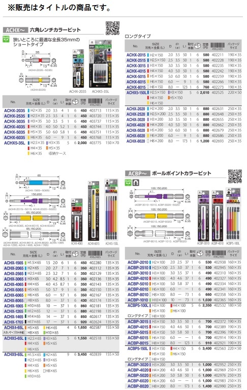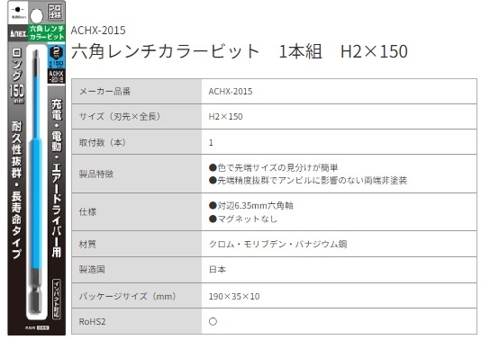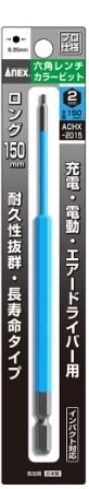 アネックス(ANEX) 六角レンチカラービット 1本組 H2x150ACHX-2015■特長・色で先端サイズの見分けが簡単・先端精度抜群でアンビルに影響のない両端非塗装■仕様・対辺6.35mm六角軸・マグネットなし■材質クロム・モリブデン・バナジウム鋼■サイズ・H2x150