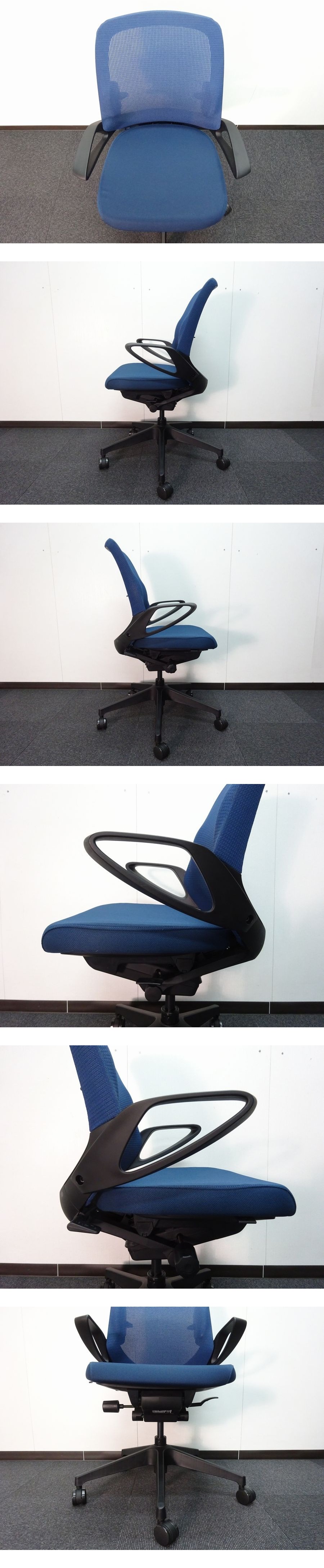 ・メーカー:イトーキ ・型番:KJ-166JV-T1B2 ・サイズ:W570(脚680)×D560~610×H880~995×SH435~550 単位(mm) ・本体、肘受け、フレーム、脚カラー:ブラック ・張地カラー:ネイビーブルー ・定価:¥105,050 オフィスファニチャーブランド イトーキのノートチェア ループ肘 ランバーサポート付です。インテリア性へのこだわりとハイパフォーマンスの両立。オフィス空間のインテリア性が高まるなかで、細部までデザインを追求。 長時間着座にも対応できる優れた機能性とデザインの融合で、上質な心地よさを生み出しました。 カジュアルな空間にも調和するデザインを目指し、樹脂部分の露出を抑え、背のフレームまでファブリックで包み、インテリア性を高めました。また、コンパクトな設計の中にも、基本機能は充実しております。ランバーサポートは背の左右にランバーパットが取付られており、腰付近のメッシュのテンションを強くして腰を支えるため、直接身体を支えることなく適度なサポート感を実現しています。 ■仕様 ・背:メッシュ張り ・座:布地張り ・背ブラケット:強化ナイロン樹脂 ・肘当て:発砲ウレタン一体成型 ・肘受け:強化ナイロン樹脂 ・脚:強化ナイロン樹脂 ナイロン双輪キャスター付 ■機能 ・アンクルムーブ・シンクロロッキング ・シートアングルストッパー ・ロッキング強弱調節 ・ベンディングシート ・ガス上下調節 ・座の奥行調節 ■状態 ・こちらの商品は2024年製未使用品となります。運搬時の若干のスレはございますが、目立つキズなど無くとても綺麗な状態です。この機会にオフィス、ご自宅にいかがでしょうか! (※未使用とは…商品を開封し、設置等しましたが一度も使用せず保管していた商品となります。) | ||||