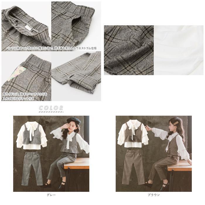 | 商品説明 | ・カジュアルにもフォーマルにも使える♪キッズ用セットアップ 3点セットが発売。 ・ブラウス、キャミソールベスト、パンツの3点セット。これだけでおしゃれコーデが完成! ・キャミソールベストとパンツは、大人っぽいトラッドなチェック柄で知的な雰囲気を演出。 ・顔周りを華やかに見せてくれるボウタイブラウス。腕周りにはフリルデザインが施され、可愛らしい印象に。 ・キャミソールベストは裾部分がふんわり広がるデザイン。 ・パンツは締めつけ感のない履き心地で、脱ぎ着も楽ちんなウエストゴム仕様。両サイドには、薄手のハンカチなどを入れておけるポケット付き。 ・入学式・卒業式、発表会などで活躍!セットではもちろん、単体でカジュアルに普段使いしてもOK。 |