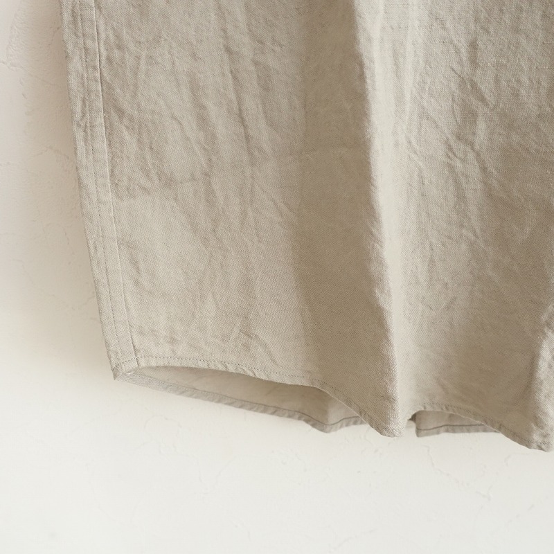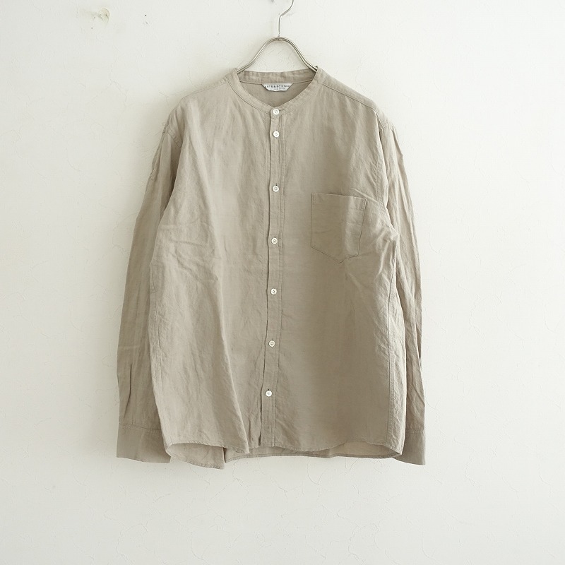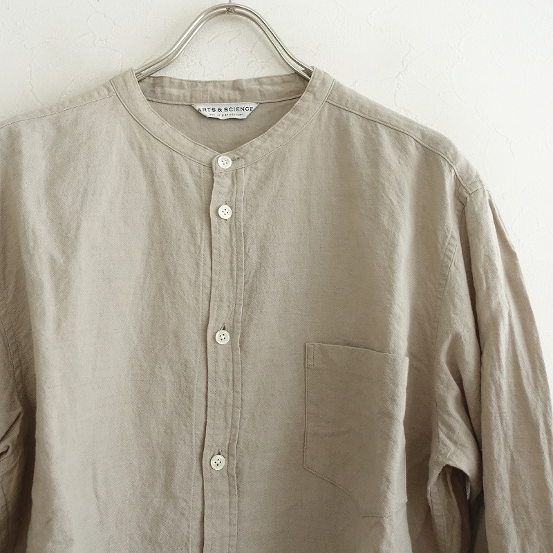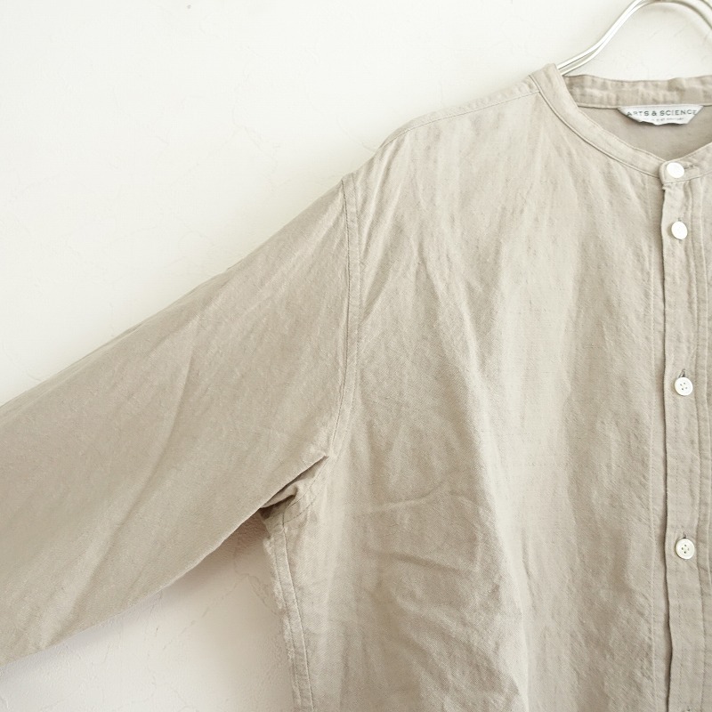 | ARTS&SCIENCEのノーカラーフェイクシャツです。カラーはグレーベージュで、綿麻混紡素材です。フロントにボタン付きですが、プルオーバータイプです。袖口はボタン留めで、左胸にパッチポケットがあり、裾はラウンドカット仕様です。定価(メーカー希望小売価格)49,500円の商品です。 |