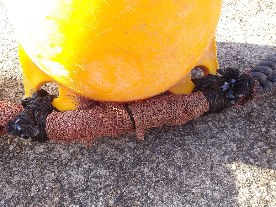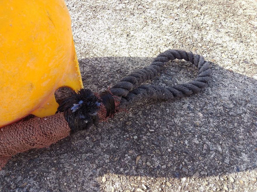 ●商品サイズ:1枚目の写真でご覧頂ける状態:直線長さ約225cm、黒色ロープ直径約30mm、ブイの直径約36cm(耳を含まず)(共に最大値)です。重さは、きちんと測っていませんが、合計重さ25KGくらいあります(ご参考までに)。(2)