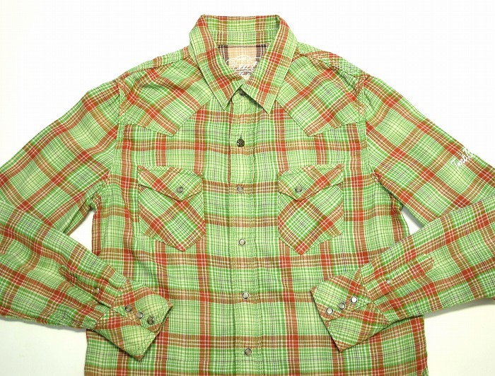 ・素材: コットン100% ・カラー: グリーン×レッド ・サイズ: M 実寸(平置きにして)肩幅 約42.5cm・身幅 約52cm・着丈 約69cm・袖丈 約65cm(多少の誤差はお許しください) 柔らかで通気性の良いガーゼ生地を2重にした、人気のダブルガーゼ生地を使用したチェックシャツです。 細部までウェスタンシャツのディティールを取り入れ、左袖にはワンポイントの刺繍入りで、シンプルすぎないデザインに仕上がっています。 ボタンはブランドネームの刻印が入ったオリジナルボタンを使用。 フロント第二ボタンはコンチョ風のスターボタンを採用し、さりげなくポイントに! 柔らかく着心地の良いアイテムです。 目立つ傷み汚れなし。 日本製 かなりお値打ちだと思います。この機会にぜひ! 他にもいろいろ出品しています。 管理番号: 042507Y-090386 ★ N3下 |