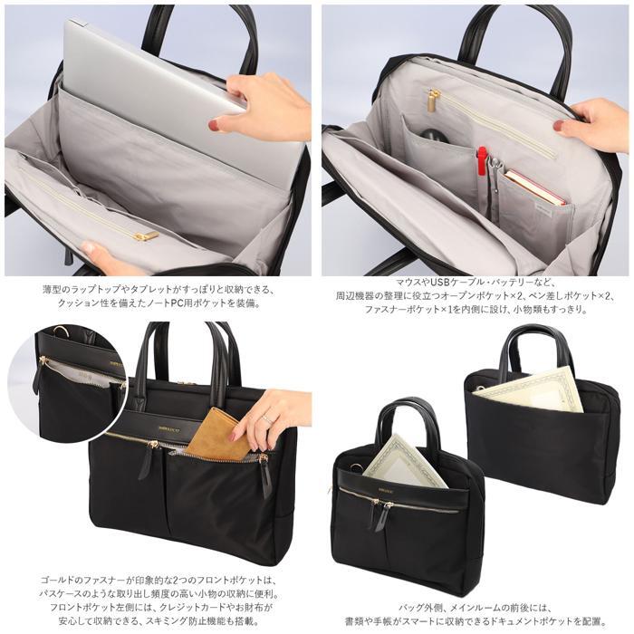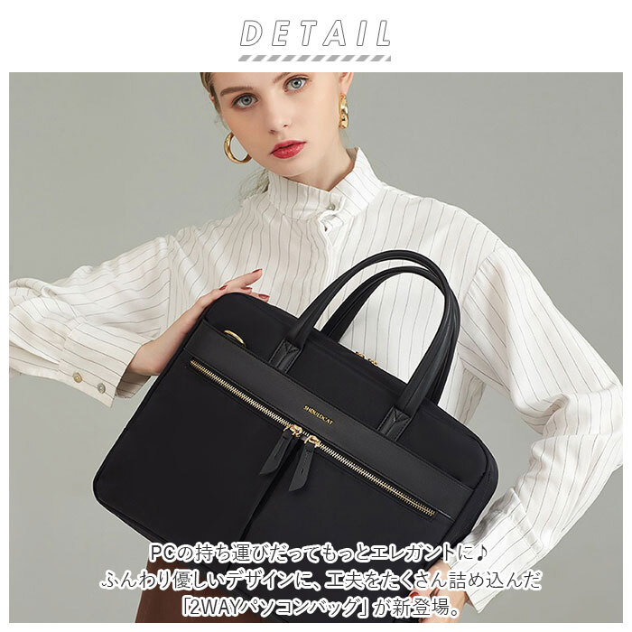 | 商品説明 | ・・PCの持ち運びだってもっとエレガントに♪ふんわり優しいデザインに、工夫をたくさん詰め込んだ「2WAYパソコンバッグ」が新登場。 ・薄型のラップトップやタブレットがすっぽりと収納できる、クッション性を備えたノートPC用ポケットを装備。 ・メインスペース開口部には、左右どちらからも開閉しやすいダブルファスナーを採用し、PCや小物の取り出しがスムーズ。 ・マウスやUSBケーブル・バッテリーなど、周辺機器の整理に役立つオープンポケット×2、ペン差しポケット×2、ファスナーポケット×1を内側に設け、小物類もすっきり。 ・バッグ外側、メインルームの前後には、書類や手帳がスマートに収納できるドキュメントポケットを配置。 ・ゴールドのファスナーが印象的な2つのフロントポケットは、パスケースのような取り出し頻度の高い小物の収納に便利。 ・フロントポケット左側には、クレジットカードやお財布が安心して収納できる、スキミング防止機能も搭載。 ・手提げタイプのPCバッグとしてはもちろん、取り外し可能なショルダーベルトで肩掛けにもできる2WAY仕様。 ・表面に撥水加工を施しているから、急な雨でも安心。(※完全防水ではありません。) ・お手持ちのデバイスに合わせて、13.3インチ・14.3インチ・15.6インチの3タイプから、お好みのサイズがチョイス可能。 ・パッと見はお洒落なお出掛け用バッグ。「本当にPCバッグ!?」と、驚きの声が聞こえてきそうな、女子力高めのルックスが魅力。 |