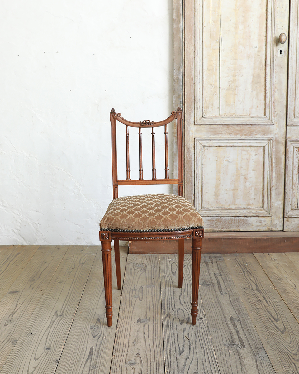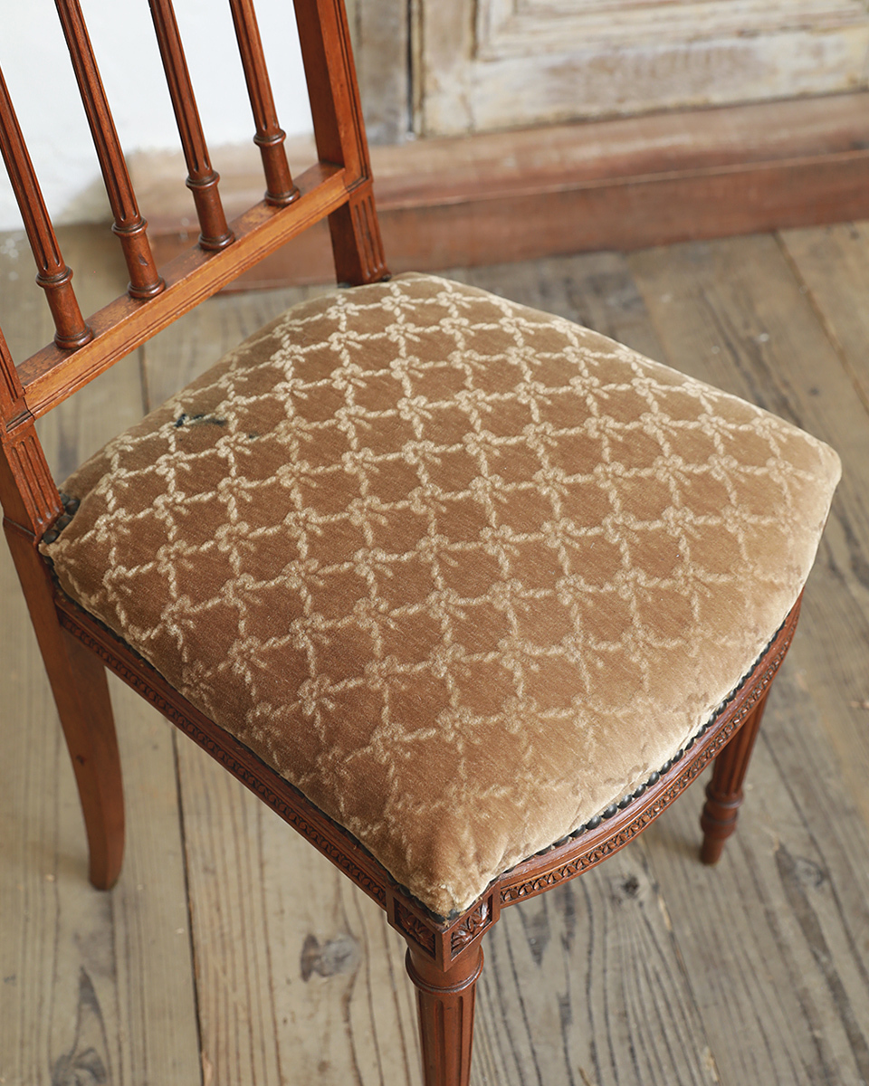 From : France (1880s) フランスアンティークらしい繊細な装飾が美しいルイ16世様式のサロンチェア。 優雅な曲線を描くフレームに配われた立体的なリボンモチーフの彫刻や、その小口にまで彫り込まれた美しい植物やパネルの彫刻にクオリティーの高さを伺えます。また背もたれの支柱や脚にはフルーティングと呼ばれるストライプ状の彫刻が施され、ルイ16世様式らしい気高さと格式高い雰囲気を纏ったひと品。 座面のダイヤ柄のファブリックが端正な佇まいのフレームと相性が良く、類稀なる存在感で高級感をいっそう引き立てます。 同じデザインで状態違いのものが4脚ございます。 座面のファブリックは入荷時の状態となります。 現状でもご使用いただける範囲ではございますが、古いもののためファブリックにシミ汚れや押し跡、解れなどが見受けられます。 また内部のクッションに多少のへたりがございます。 生地の張り替えをご希望される方は別途有料(8,000円~)にて承ります。詳細につきましてはお気軽にお問合せくださいませ。 商品はアンティーク品のため、お写真では伝わり難い色褪せや小傷などがございます。追加のお写真をご希望の方はお気軽にお問合せくださいませ。 商品はメンテナンスを施してからの発送となりますので、お届けまでに7日間ほどお時間をいただく場合がございます。 お急ぎの方はお気軽にご相談くださいませ。 |