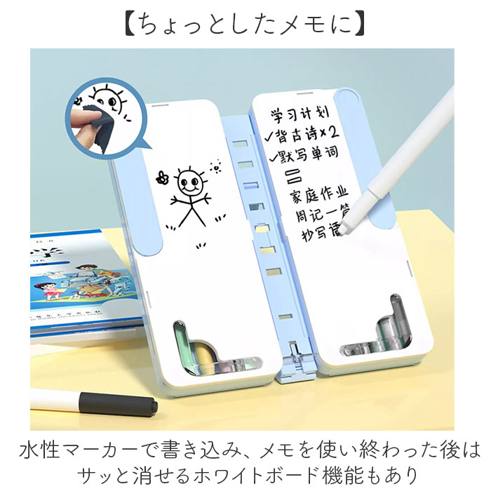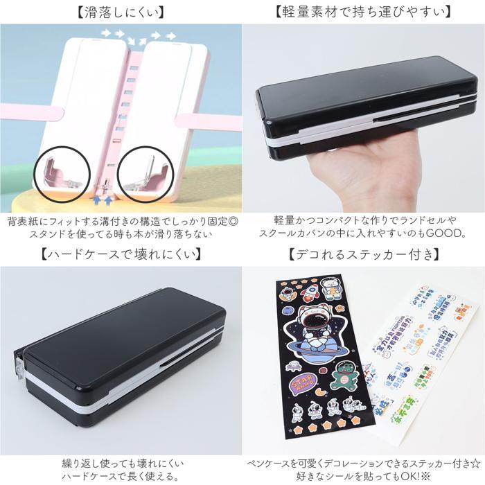 | 商品説明 | ・・【より勉強が捗る機能性が◎】 ・教科書など立てて使えるブックスタンドなど多機能に使える便利なペンケース。 ・【ペンや文房具の収納に】 ・2つの収納ルームでペンなどの文房具がしっかり入る◎仕切りがなく様々な小物に対応。 ・【ちょっとしたメモに】 ・水性マーカーで書き込み、メモを使い終わった後はサッと消せるホワイトボード機能もあり ・【教科書やテキストが見やすい】 ・教科書やテキストが見えやすいスタンドとブッククリップも搭載。ノートを書くのに集中できる ・【滑落しにくい】 ・背表紙にフィットする溝付きの構造でしっかり固定◎スタンドを使ってる時も本が滑り落ちない ・【軽量素材で持ち運びやすい】 ・軽量かつコンパクトな作りでランドセルやスクールカバンの中に入れやすいのもGOOD。 ・【ハードケースで壊れにくい】 ・繰り返し使っても壊れにくいハードケースで長く使える。 ・【デコれるステッカー付き】 ・ペンケースを可愛くデコレーションできるステッカー付き☆好きなシールを貼ってもOK!※ ・【注意事項】 ・※ステッカーのデザインはカラーにより異なります。ご注文時お選びいただけませんので予めご了承ください。 |