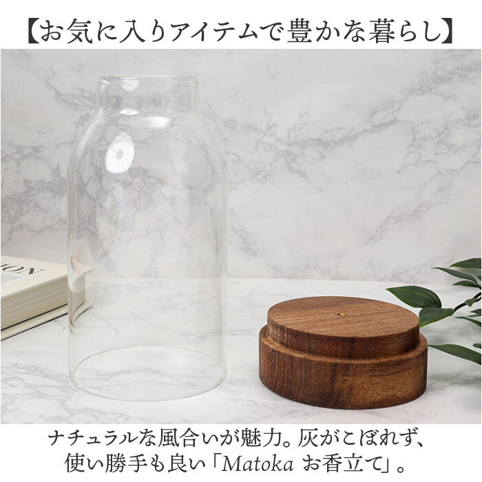 | 商品説明 | ・・【お気に入りアイテムで豊かな暮らし】 ・ナチュラルな風合いが魅力。灰がこぼれず、使い勝手も良い「Matoka お香立て」。 ・【天然木とガラスの凛とした佇まい】 ・絵になる柔らかなフォルム。木目が美しい天然木の土台とガラスカバーの組み合わせがおしゃれ♪ ・(※)天然木の色や形に個体差があります。 ・【カバーを外してお手入れも簡単】 ・ガラスカバーをサッと取り外し。土台に溜まった灰も、すぐに拭き取れば汚れが残らない◎ ・【お香を立てて香りを楽しめる】 ・約3mmまでの太さのお香を立てることが可能。スティックタイプ専用のお香立て。 ・(※)長いお香は本体の外に灰が落ちる可能性があるため、長さ15cmまでをおすすめします。 ・【ドライフラワーを飾る花瓶としても】 ・お香立てだけでなく、ドライフラワー立てとしても活躍。使い方を選べるのが嬉しい♪ |