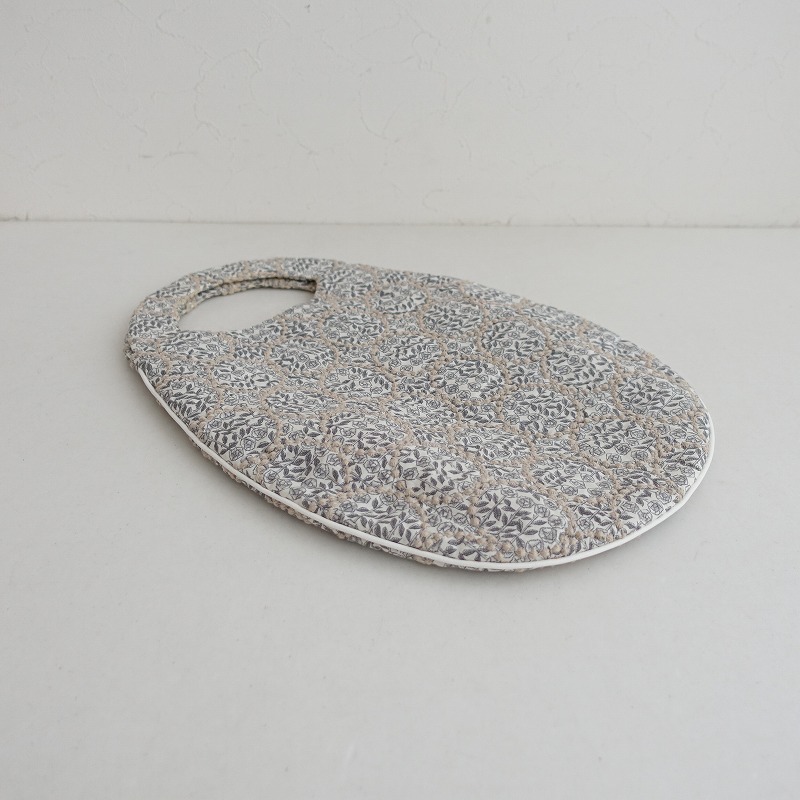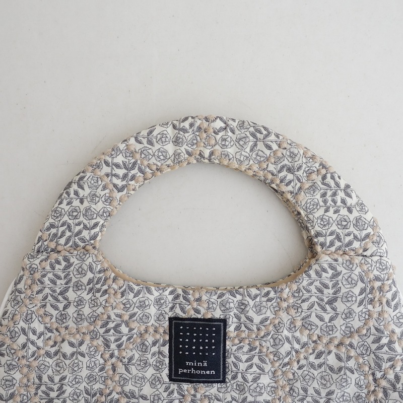 | mina perhonenのsleeping rose+tambourine エッグバッグです。カラーはグレー系の「sleeping rose」がベースにライトベージュの色糸で「tambourine」のテキスタイル刺しゅうが施されたデザインです。サイド周りはライトベージュのパイピングが施されており、内側は光沢のあるライトベージュの裏地が付いています。 素材は表生地が綿100%、裏生地がポリエステル100%です。 定番で人気の高いegg bag、卵型のコロンとした雰囲気とすてきなテキスタイルがコーディネートのアクセントになります。 |