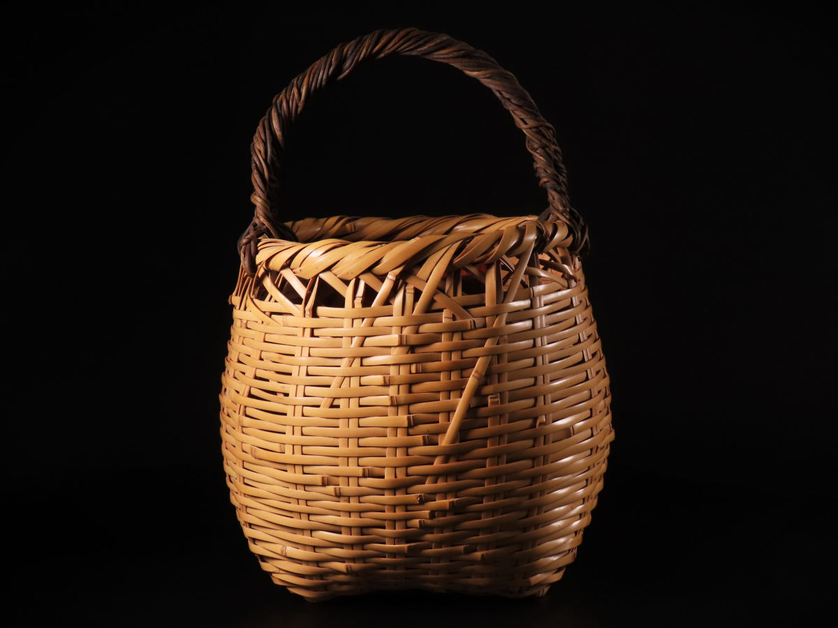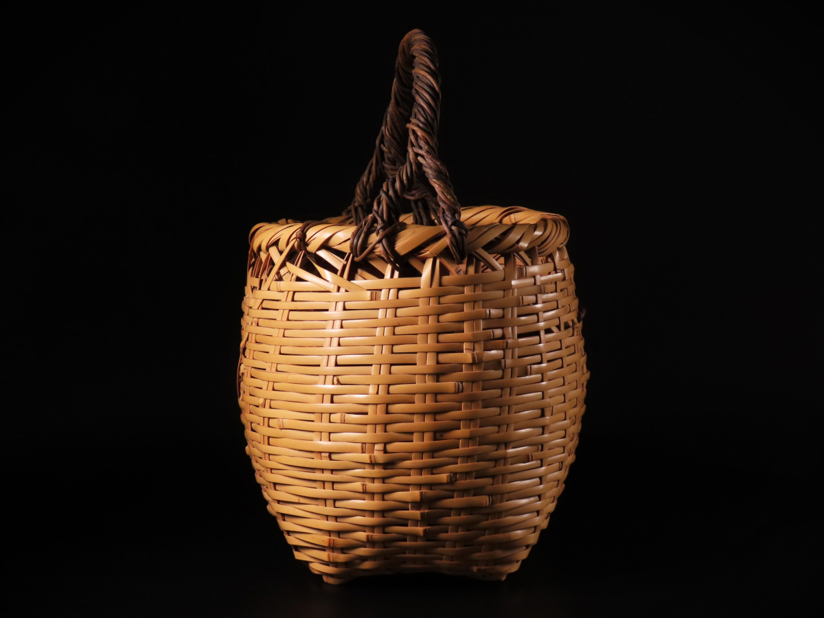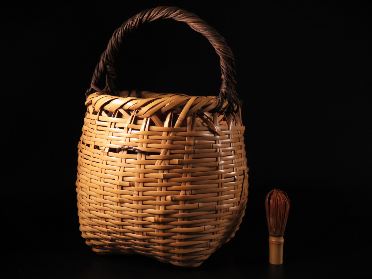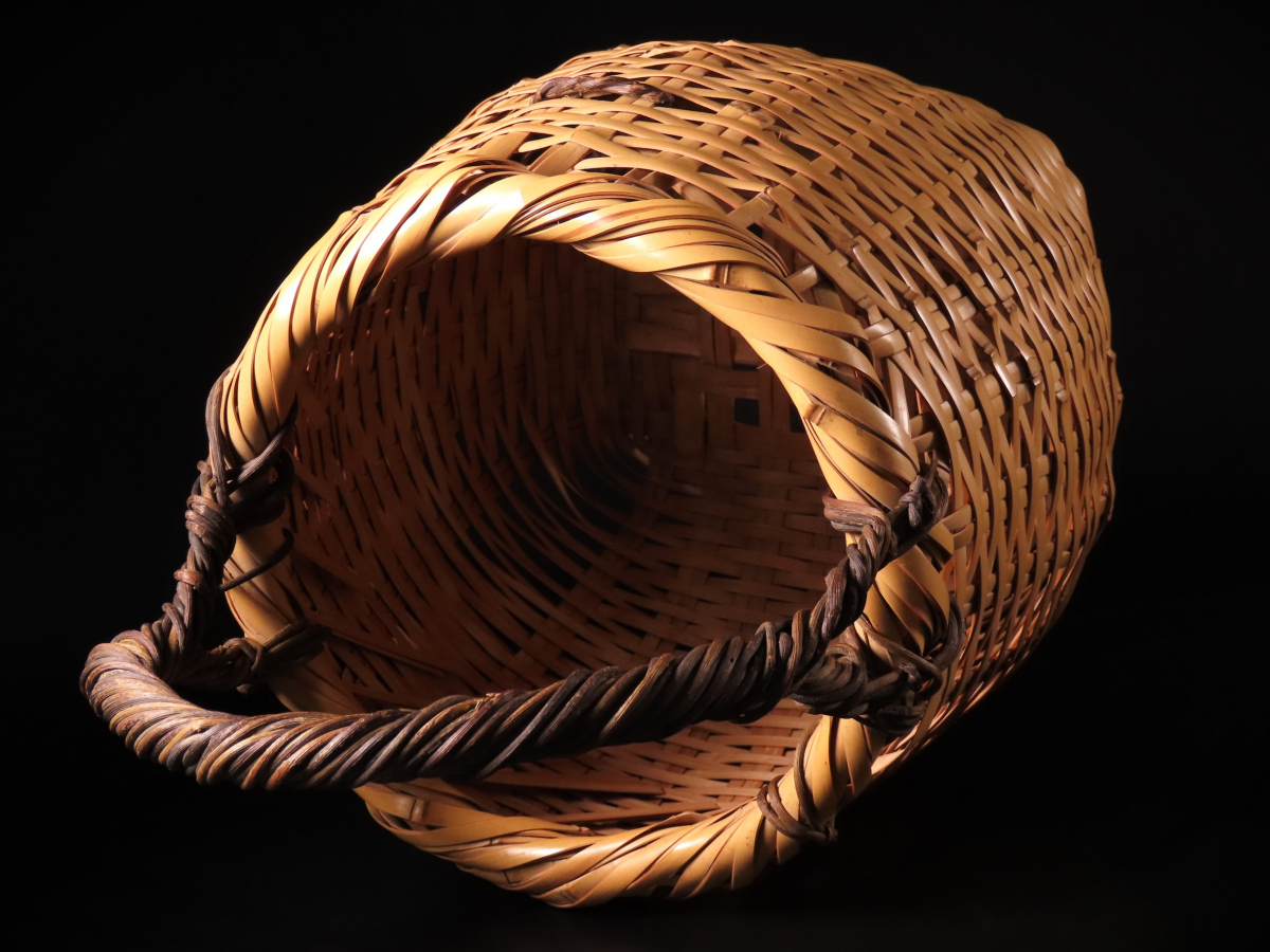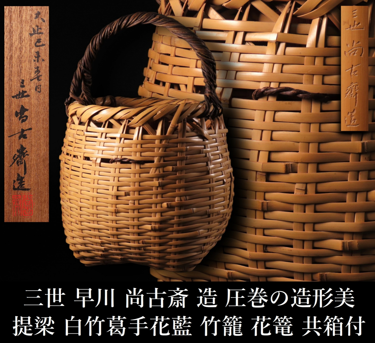 【ONE'S】三世 早川 尚古斎 造 圧巻の造形美 提梁 白竹葛手花藍 高38cm 花籠 竹籠 花篭 花入 竹編造 唐物 竹工芸 華道具 共箱付 伝統工芸 | |||
