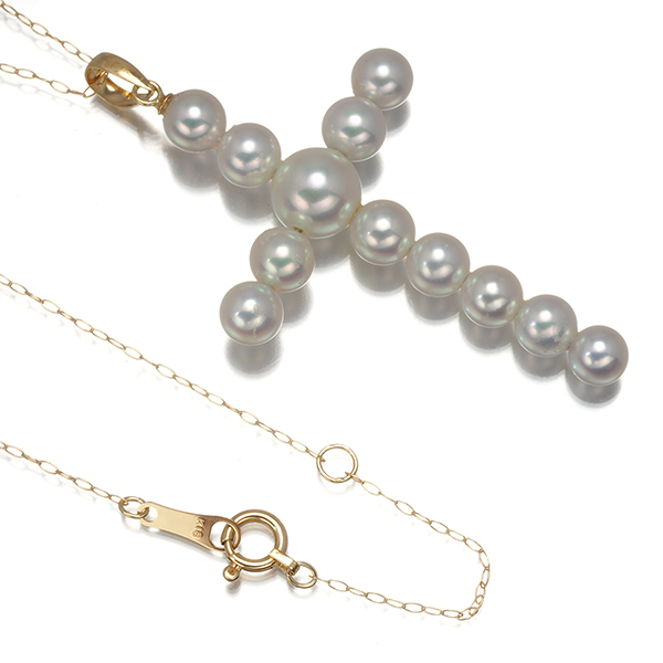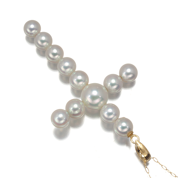 数珠に僅かな真珠層の剥がれが見られますが、胸元には気にならないレベルの上質なテリ煌めき美しいクロスモチーフを描いたネックレス。胸元を明るく照らしてくれるパールジュエリーを是非いかがでしょうか。 |