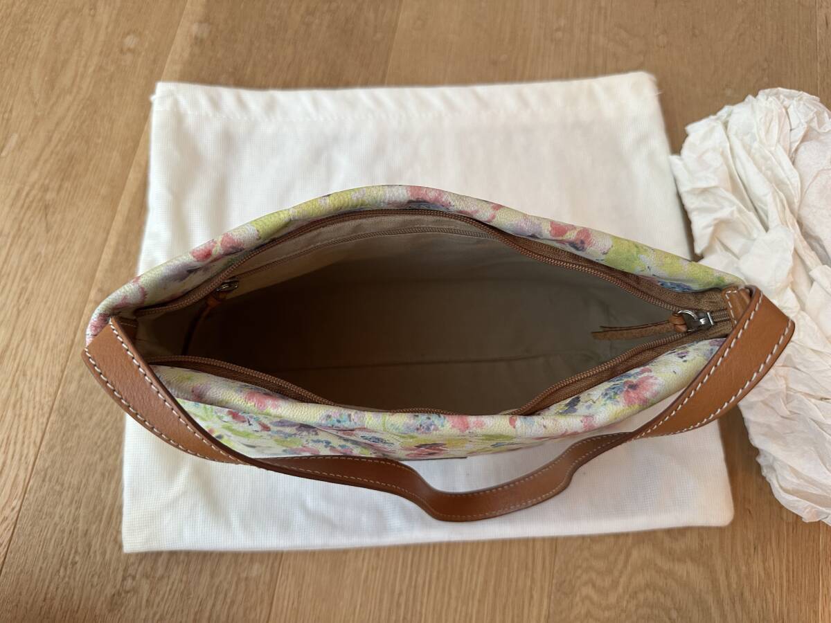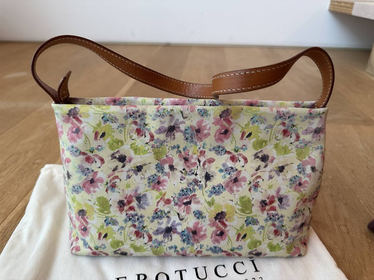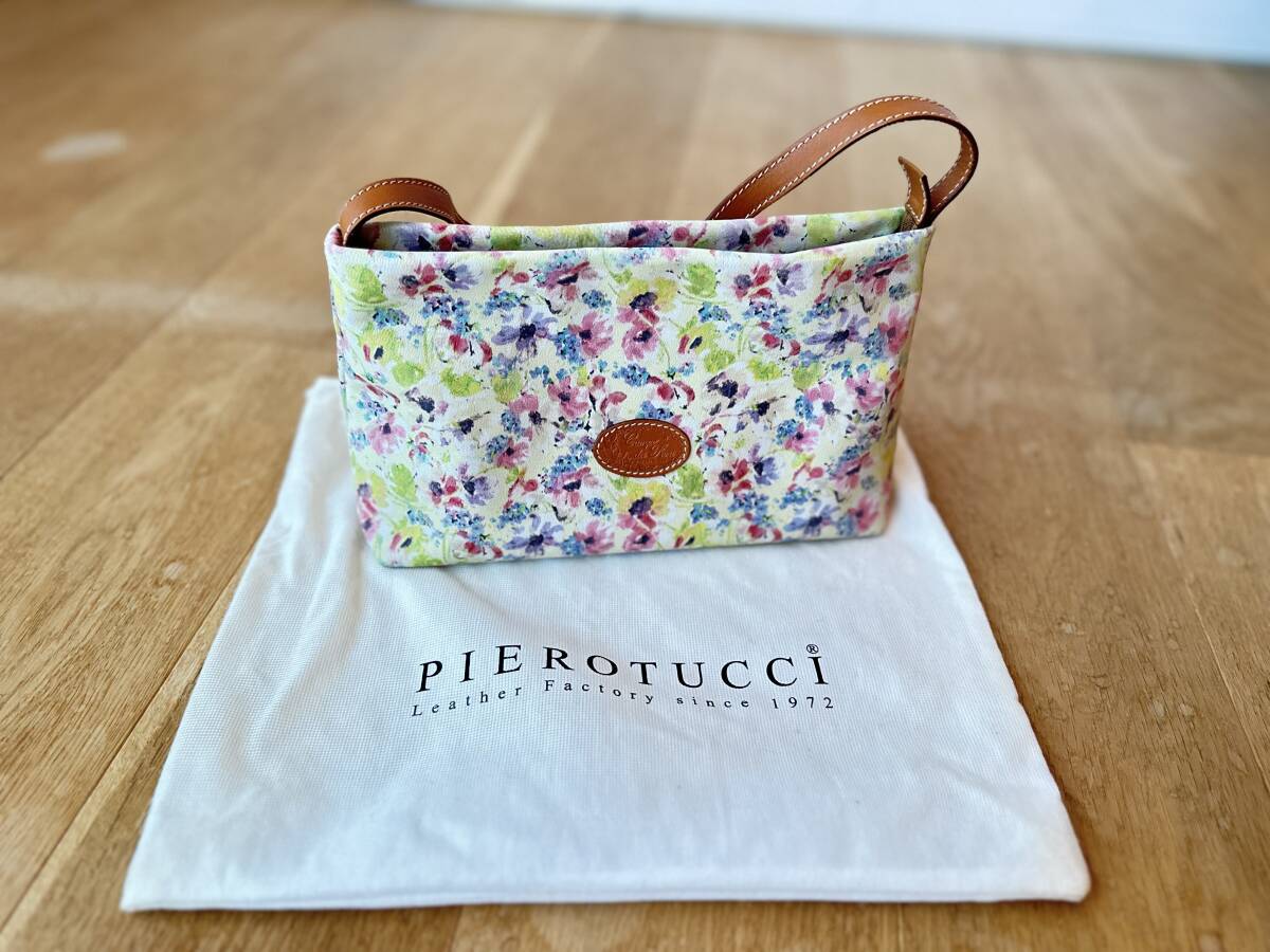 イタリアで購入したPIEROTUCCIのハンドバッグです。サイズは底面25cm x マチ8cm x 高さ16cmです。合皮でよごらがつきにくい感じがします。きれいですがユーズド品をご理解の上入札ください。
