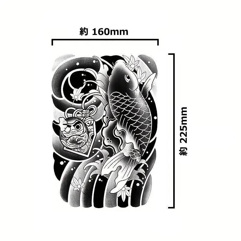 | 台紙サイズ 約 16cm×22.5cm 肘から手首ほどのサイズのタトゥーシールです。 ※敏感肌、目の近く、または接着剤にアレルギーがある場合は使用しないでください。 【使用方法】 ●透明フィルムを剥がし、スプレーまたは濡れタオルでステッカーをしっかりと濡らして下さい。 ●10秒間、肌に密着させ、ステッカーを剥がします。その後約2時間濡らさないで下さい。 ●約、6時間後に発色開始→約24~48時間程度で完全発色します。 ●約1~2週間持続します。 【貼る時のコツ】 シートそのままの大きさだと曲げ辛く密着しにくい為、余白部分を切ってから貼るのがコツです。 ※商品画像の色味は画面でみた場合と実際は多少の色差が生じる場合がございます。 ※海外製品のため入荷時点でしわや折れ目が付いている場合がございますが、ご使用には問題ございませんので予めご了承ください。