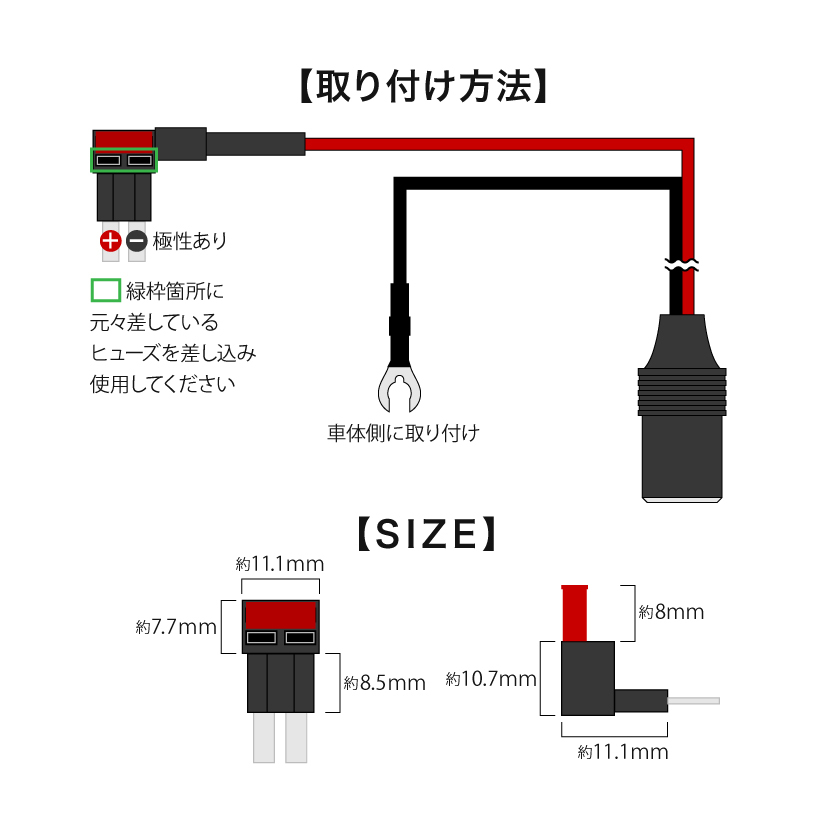 | 内容 | シガーソケット付マイクロ2電源取り出しヒューズ、10Aヒューズ | 入力電圧 | 12V |