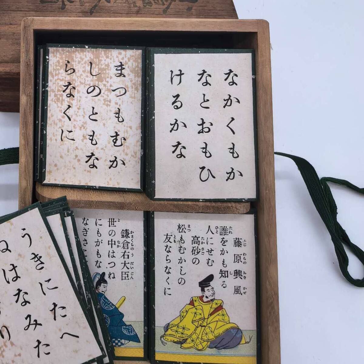 ・ブランド:小倉百人一首 歌かるた 木箱入り 日本伝統玩具 ・商品紹介:日本伝統カードゲーム「小倉百人一首」かるたセット。木製収納箱付きで、和歌の文字が印刷された札と、裏面には古代歌人の挿絵が描かれています。コレクションとして、和歌の学習用として、また日本の伝統文化を体験する道具としても最適です。 ・詳細:長:14cm、幅:19cm、高さ:8cm。※素人採寸につき、多少の誤差はご容赦ください。 ・状態:古い品のため、経年によるシミや汚れがあります。カードの枚数は写真にてご確認ください。 |