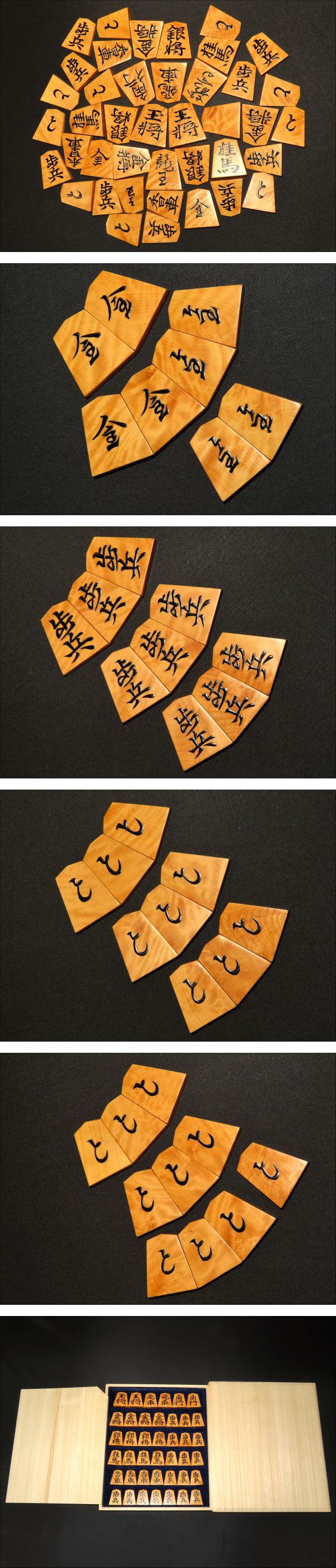 木地は御蔵島黄楊根杢(ねもく)。ご覧の通り味の良い木地です。全ての駒の表裏をUPしてございます。是非ご覧下さい。