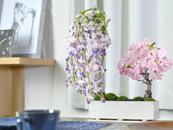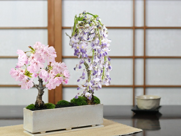 商品詳細  桜盆栽 桜と藤のモダン寄植え【受皿付き】盆栽シンプルライフシリーズ L 盆栽 藤 人気 花芽 ミニ盆栽 花見 四季 鉢植 お祝い プレゼント 鉢花 贈り物 サクラ SPEC 樹高25cm×幅10cm 鉢幅23.3cm×奥行6.5cm×高さ6.5cm 受皿幅23.3cm×奥行6.5cm *写真は代表的なイメージ写真になります。お届けする盆栽は数量物の為、高さ、枝ぶり、鉢の種類が写真とは異なる場合がございます。 育て方冊子と肥料が付属しますので初心者でも安心です。電話・メールでのサポートもしております。 ラッピングは無料です。ご注文時にお申しつけ下さい。通常2営業日以内に発送致します。お急ぎの場合はご連絡下さい。土日祝日は発送お休みです。