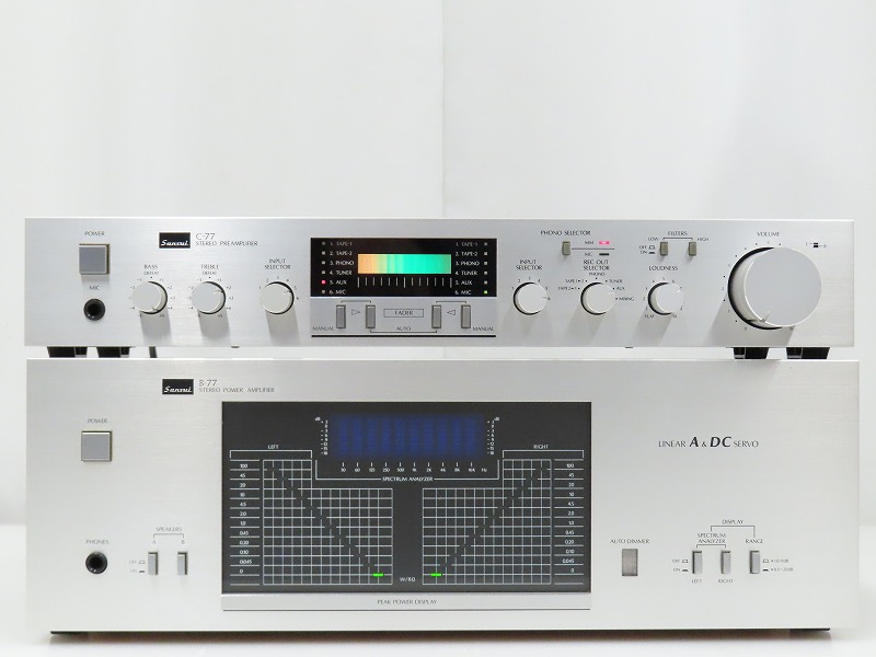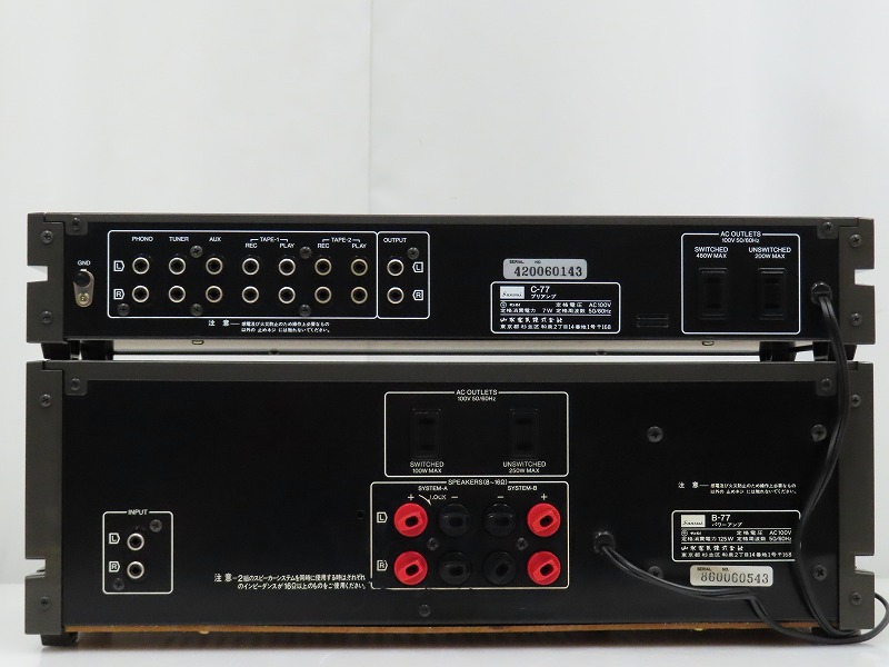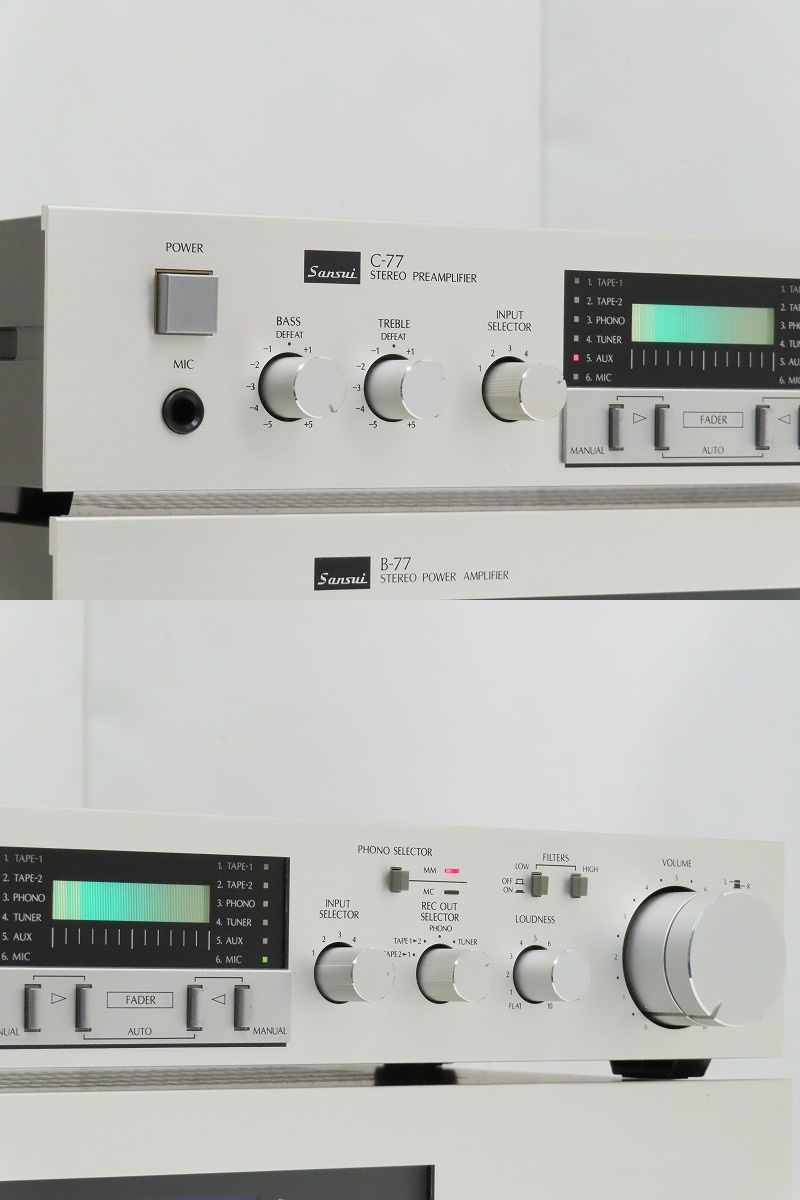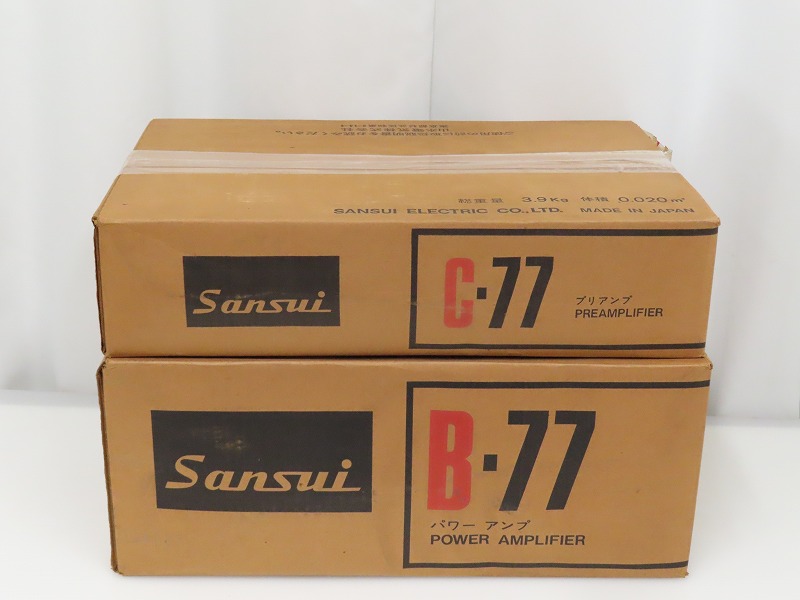 ■メーカー : SANSUI ■型番 : C-77/B-77 【商品の状態 当店での確認内容】 B-77の基本動作は確認出来ておりますが、C-77はボリュームにガリ/スピーカー・ヘッドフォン時右チャンネルから出音が確認出来ません。 ※上記により【難あり商品】としての出品となります。 「商品の状態」に関しましては当方主観の目安となります。外観などは中古品で個人差もありますので詳細は画像にてご判断ください。 画像にて不明な点はご質問下さい。 出品商品は画像のものですべてになります。画像に写っているもの以外は付属いたしません。 ※注意※ のシステム上、送料表記が送料未定となっておりますが、送料に関しては全て有償となりますので下記を参照下さい。 【送料 全国一律 4,160 円 沖縄、離島は別途お見積り】 ※送料がお得になるサービスです(下取りシステムのご案内です) ストア決済利用時にクレジットカードやPayPay残高/PayPayクレジットを利用の方は留意点がございますのでこちらを参照上ご利用ください。 当ストアでは商品を安全にお届け出来るよう提携運送会社と協議の上、発泡緩衝材や強度段ボールの使用等 運送会社が指定する梱包方法や資材を採用しております。 より安全にお届け出来るよう商品仕様により梱包サイズが大きくなる場合や個口数が増える事がございます。 【当ストアオークションルールを入札前に必ずご確認ください。】 【落札後の取引手順】 ・落札後は取引ナビにて、必要事項をご入力後、送信ください。 取引終了後48時間(土、日は除く)以内に入力をお願い致します。 ※ご連絡が頂けない場合は落札者様都合でのキャンセルとさせていただきます。 ・落札代金(商品代金+消費税+送料)の入金をお願い致します。 ※大型商品の場合は送料確定後の決済となる為取引ナビを入力頂き、当ストアより送料のご案内が来るまでお待ちください。(土曜、日曜、祝日の場合は翌営業日より順次ご案内いたします) ・お支払い方法はクレジットカード/PayPay残高/PayPayクレジット/PayPay銀行/ゆうちょ銀行のみです。 ※商品代金引換(代引き)のお取り扱いはしておりません。 ※領収証の発行が必要な方はご連絡ください。 ※銀行振込の際の振込手数料はご負担願います。 ・入金確認後に出荷手配を致します。 (原則入金確認後3営業日以内に発送いたしますが、大型や重量のある製品はお時間をいただく場合もございます。) ・発送は当店指定の運送会社の元払いのみでの発送となります。 ※他の運送会社、送料代引き等は致しかねます。 ※落札者様ご自身での運送会社の手配いただく事も可能ですが荷物事故の責任の所在の問題上、梱包は致しかねます。 ※店頭にお越し頂き手渡しも可能(福岡市早良区)です。ご希望の方はご落札後にご連絡下さい。 ・大型/重量物商品の送料につきましては商品の特性上、荷降ろし状況等により送料が大きく前後し運送業者に別途見積りが必要な為、早めのお問い合わせにてお見積り上、入札をお願い致します。 【初期不良の保証について】 ・商品到着後の初期動作不良、また配送中の事故による破損、不具合が有る場合は、商品発送後10日以内に当ストアまでご連絡ください。当ストアでは修理での対応を優先させて頂きますが、修理不可の場合は全額返金させて頂きます。 (商品代金+消費税+送料のお支払い頂いた金額となります) 【初期不良の保証の対象外について】 次の場合は保証の対象外となりますのご留意ください ・ジャンク商品、現状商品、難あり商品での出品商品。 ※難あり商品に関しましては動作確認時に一部動作不良が確認された商品になり、記載している動作確認以外にも、動作不良がある可能性もございます。こちらに関しましても保証対象外となりますことをご理解ください。 ・年代物のオーディオなどで、当店にてわからない範囲で部品が交換されている場合 ・楽器類の特殊機材(マイクロスコープ等)での確認までは行っておりません。気になる方は事前にご質問いただくか、入札をお控えください。 ※初期不良に関しましては【商品の状態】に記載のもの、またそれによって起因する動作不良は対象外です。 ※商品発送後10日を過ぎてのご連絡は対応が出来ませんので、商品が到着しましたらお早めに確認をお願い致します。 【メーカー保証の加入・継承】 ・未使用品、展示品やメーカー保証期間が残っている商品に関しまして、メーカー保証の加入、継承が必要な方は、落札後取引ナビ内にて当ストアにお知らせください。商品発送までにご連絡いただけない場合、メーカー保証の手続きを承れない場合があります。 【評価について】 ・評価不要の場合、必ず取引ナビの「要望欄」にてお知らせください。それ以外でご連絡をいただいた場合、対応できない可能性がございます。一度行った評価はシステム上取り消しが行えませんのでご了承ください。 【入札削除・キャンセルについて】 ・入札後はトラブル防止の為いかなる事情がおきましても