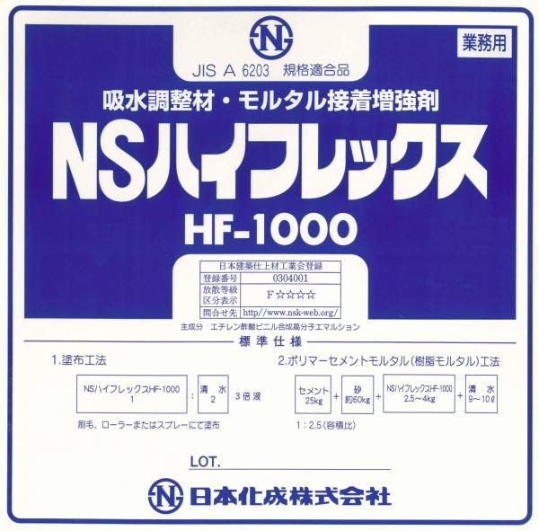 | NSハイフレックス HF-1000 (吸水調整材として) | 4㎏ | 内・外壁 内・外床 | コンクリート・モルタルの壁 :150g/㎡(5倍希釈液) コンクリート・モルタルの床 :200g/㎡(5倍希釈液) ブロック、ALCパネル :400g/㎡ (5倍希釈液) | コンクリート・モルタルの壁 :135㎡/缶(5倍希釈液) コンクリート・モルタルの床 :100㎡/缶(5倍希釈液) ブロック、ALCパネル :50㎡/缶 (5倍希釈液) |