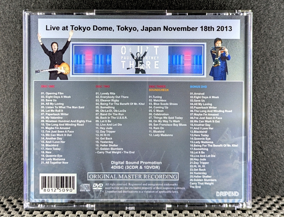 「アウト・ゼア・ジャパン・ツアー2013」の東京初日となった11月18日東京ドーム公演をコンプリート!さらにライブ当日のサウンド・チェックもコンプリートしてここに。そして当日のライブ映像ディスクもカップリングした豪華セットにて。