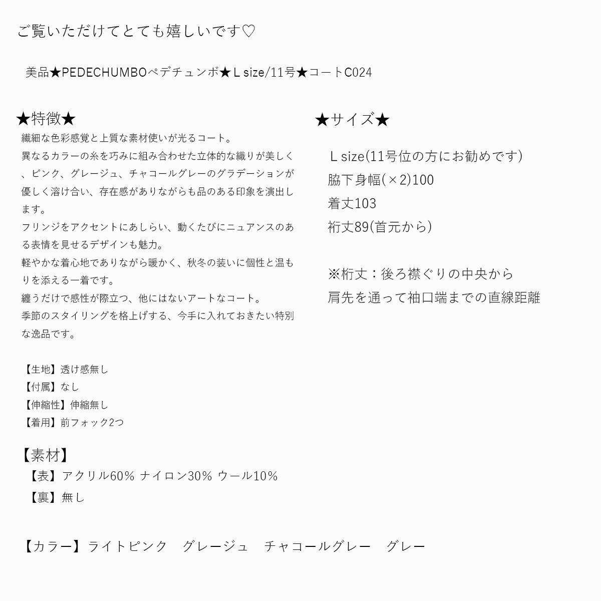 ★コメント★ *キャンセル・返品について ご入札後のキャンセル、 落札後の返品・交換はご遠慮頂いております。 商品に不備がある場合は取引ナビよりご連絡をいただけたら幸いです。 最後まで誠実に対応努めます。 何卒ご理解いただけますようよろしくお願い致します 。 *商品状態 出来る限り気持ち良くお召しいただけるよう心がけます★ 管理には十分気をつけております。 見落としやサイズ計測の誤差などがある可能性もございます。 完璧な商品をお求めの方はご入札をお控えくださいませm(_ _)m *付属品(インナーやベルト等)もともとついていたものが無い場合は記載いたします。 品質表示に記載がない場合は対応できないことをご了承くださいませ。 *即決について 大変申し訳ございません。オークション即決はお受けしてございません。 ご了承いただけたら幸いでございます。 *悪い評価のある方、新規IDの方の入札について こちらの判断によりお取り消しさせて頂く場合がございます。 出品者の立場から落札者様に規定を設け本当に申し訳ございませんが ご了承頂けたらと思います。 *ご質問について 日曜日(オークション終了日)ご質問の返信が出来ない事がございます。 購入時期、購入価格等わかる物に関してはできる限り記載をいたします★ その旨のご質問に関しても同様に返信できない場合がございます。 ご了承下さいませ。 不便でございますがご了承いただけたら幸いです。 毎週火曜日500着程、新しい商品を出品してございます! 日曜日、月曜日22時から23時終了するよう設定してございます。 お時間がございましたらご覧いただけましたら嬉しく思います★ 何かございましたらお気軽にご質問お待ち申し上げます! |