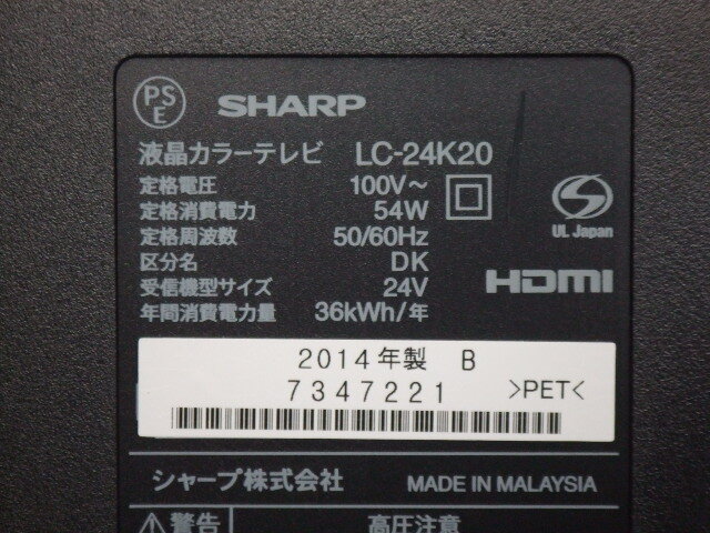 | シャープ(SHARP)の24インチ 地デジ ワイド液晶テレビです 型番:LC-24K20 TV:地デジ、BSデジタル、110度CSデジタル、VHF、UHF 入力:HDMIx3、D5、ビデオ、PC(アナログ D-sub) 付属品:リモコン、B-CASカード (電源コードは本体から直接出ています) 注意:説明書やその他の付属品はありません。 主な仕様 ・液晶パネルの解像度 1,366×768ピクセル(ハイビジョン液晶) ・コントラスト ・・ 10,000:1 ・視野角 ・・ 176度 ・LEDバックライト ・USB外付けハードディスク(別売)録画対応 ・2画面表示対応 仕様はここで確認してください。 説明書もダウンロードできます。 https://www.sharp.co.jp/aquos/products/lc24k20_outline.html 中古品ですので、傷、汚れがあります。 液晶画面には目立つ傷はないと思います。 (多少の擦り傷などはありますので、ご了承ください) 基本的な動作は確認済ですが、BSデジタル、110度CSデジタルはアンテナがないため確認できていません。 細部に渡っての動作は確認しておりませんので、完璧な商品を求められる方は入札を控えてください。 |