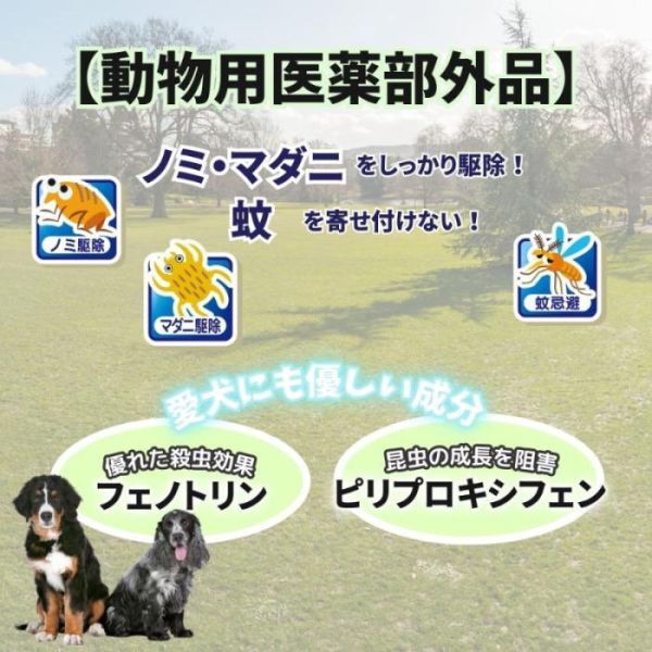 | 商品説明 | ・愛犬にやさしいフェノトリンとピロプロキシフェンを配合、ノミ・マダニをしっかり駆除し、蚊も寄せ付けない。 ・約1週間で効果があらわれはじめ、約6ヶ月間持続。 ・抗菌バックルを使用。 <使用方法> 犬または猫の首に本品1個を取り付けてください。 使用直前に開封し、あまりきつくならない程度(首と本品のすき間に指が2〜3本入る程度)首につけてください。 ※バックルを通してあまった部分は、動物に傷をつけないよう注意して、約5〜7cm余裕をもたせ、ハサミ等で切り取ってください。 生産地:日本 サイズ:パッケージサイズ:W90×H165×D18mm/重量32g 本体サイズ:長さ35cm 素材<成分> フェノトリン(ピレスロイド系)、ピリプロキシフェン(ジフェニルエーテル系) |