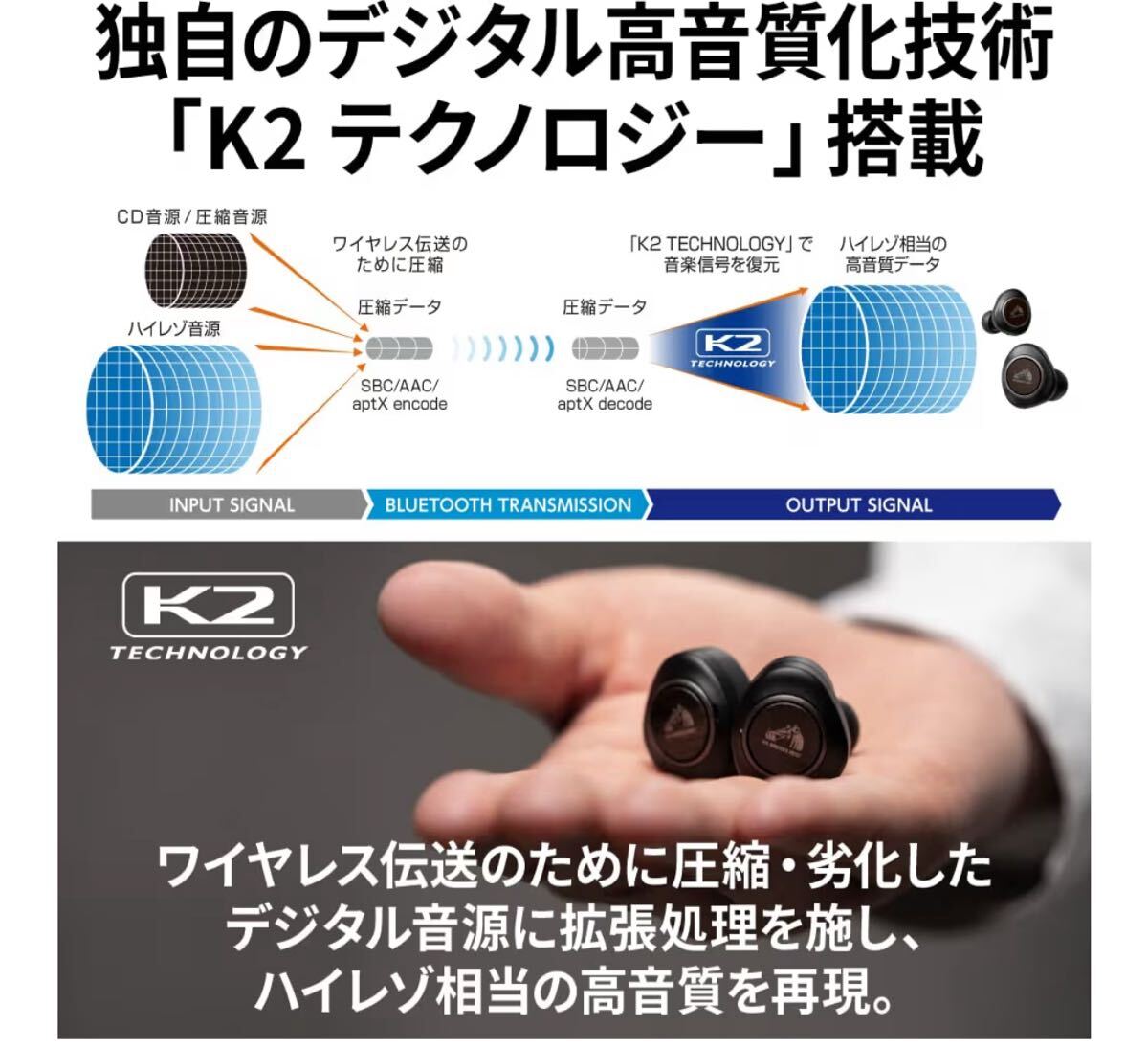 ●【接続機器を選ばずハイレゾ相当の高音質が楽しめる】デジタル高音質化技術「K2テクノロジー」を完全ワイヤレスイヤホンに初めて搭載。圧縮・劣化したデジタル音源の高周波数帯域、微小信号に拡張処理を施し、オリジナルマスターに迫るクオリティでハイレゾ相当の高音質を再現。イヤホン側でコーデック種類を判別して信号処理を行うため、接続する機器を選ばず、ハイレゾ相当まで拡張して原音に近づけます※1。