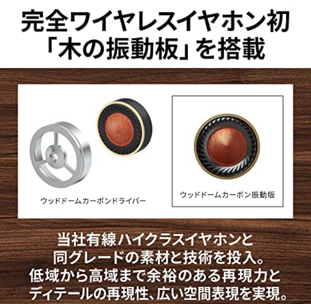 ●【「木」が奏でる完全ワイヤレスイヤホン】音の伝搬速度が速く、振動の減衰特性に優れ、振動板として理想的な“木"を完全ワイヤレスイヤホンに初めて搭載。“木"を加工したウッドドームをカーボンコーティングしたPET振動板に組み合わせることで、伝搬速度と減衰特性を向上。ウッドドームカーボンドライバーには大口径11mmのウッドドームカーボン振動板に加えて、ステンレスドライバーケースなどの有線ハイクラスイヤホンと同じグレードの素材と技術を投入。低域から高域まで余裕のある再現力とディテールの再現性、および広い空間表現を高いクオリティで実現。