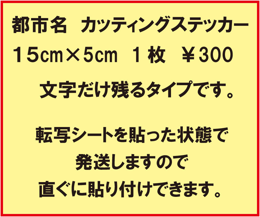 都市名カッティングステッカー 文字だけが残るタイプです 15cm×5cm 1枚 ¥300 カッティングの色は黒・赤・白です。 指定が無い場合は黒色で仕上げます。 発送先は日本国内限定 普通郵便にて発送します。 サイズ変更・枚数変更などの場合 落札前にお問い合わせください。 いろいろご要望に答えることできます