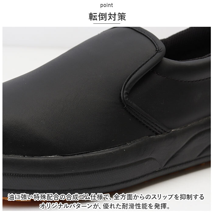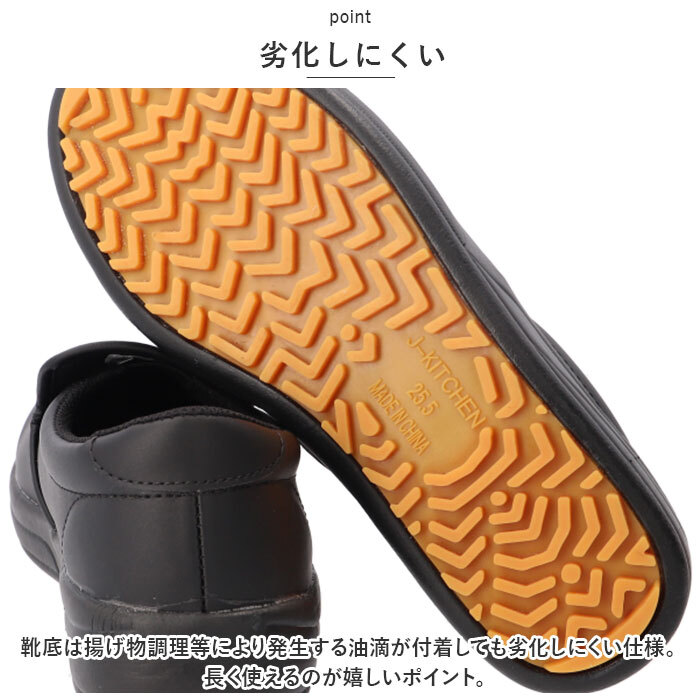 | 商品説明 | ・・優れた耐油・耐滑性能で厨房の作業に最適!転倒対策を目的として開発された「J-キッチン 厨房シューズ」が登場! ・【厨房用シューズ】 ・優れた耐油・耐滑性能を発揮する、厨房用シューズ。食品工場や飲食店の転倒対策として開発された靴なので、機能性バツグン! ・【転倒対策】 ・油に強い特殊配合の合成ゴム仕様で、全方面からのスリップを抑制するオリジナルパターンが、優れた耐滑性能を発揮。転倒対策に◎ ・【劣化しにくい】 ・靴底は揚げ物調理等により発生する油滴が付着しても劣化しにくい仕様。長く使えるのが嬉しいポイント。 ・【靴紐レス】 ・スリッポンタイプで着脱がラクラク。紐レスで結び直す必要がなく作業もはかどる。 ・【外せるインソール】 ・インソール部分は取り外し可能。洗濯しやすく清潔に保てるのも嬉しいポイント。 ・【シンプルデザイン】 ・飽きの来ないシンプルなデザイン。シーンも選ばずに使えるので、作業時はもちろん普段使いもOK! |