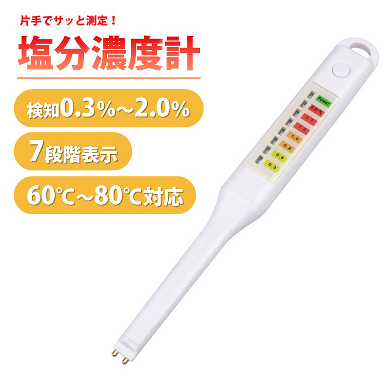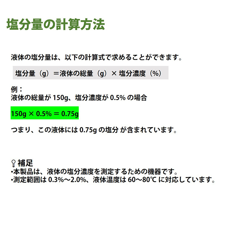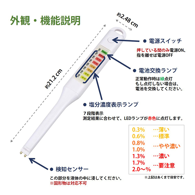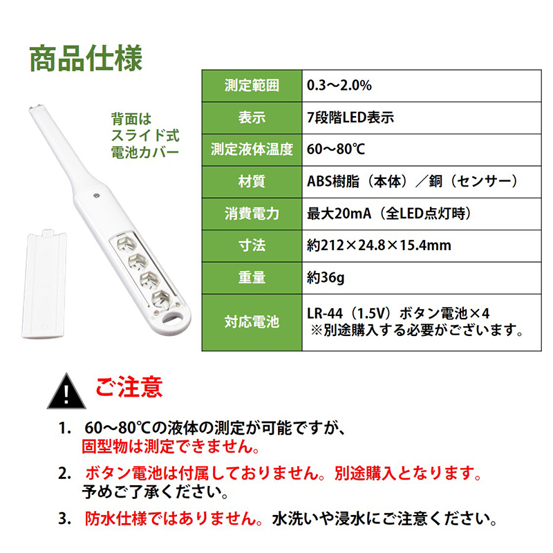 センサーを液体に入れて、ボタンを押すだけで濃度が分かります。 |