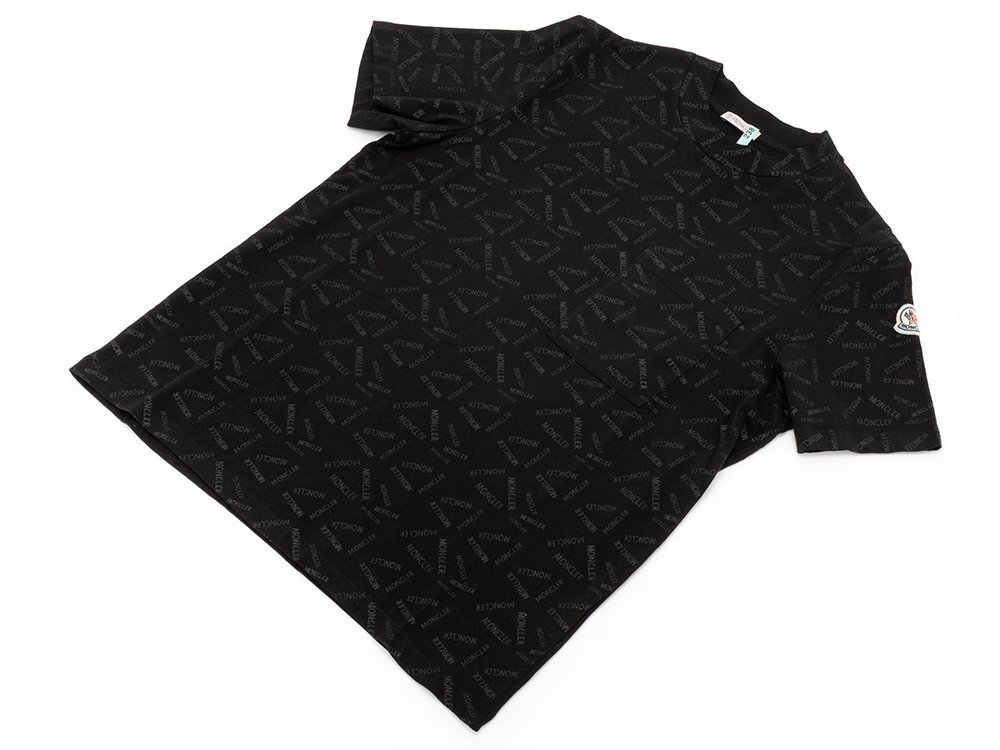 袖丈短めのモンクレール メンズTシャツXSサイズです。シャツの前面にロゴがプリントされ、裏面は無地で肩口にロゴワッペンが付いています。タグの一部が切り取られています。