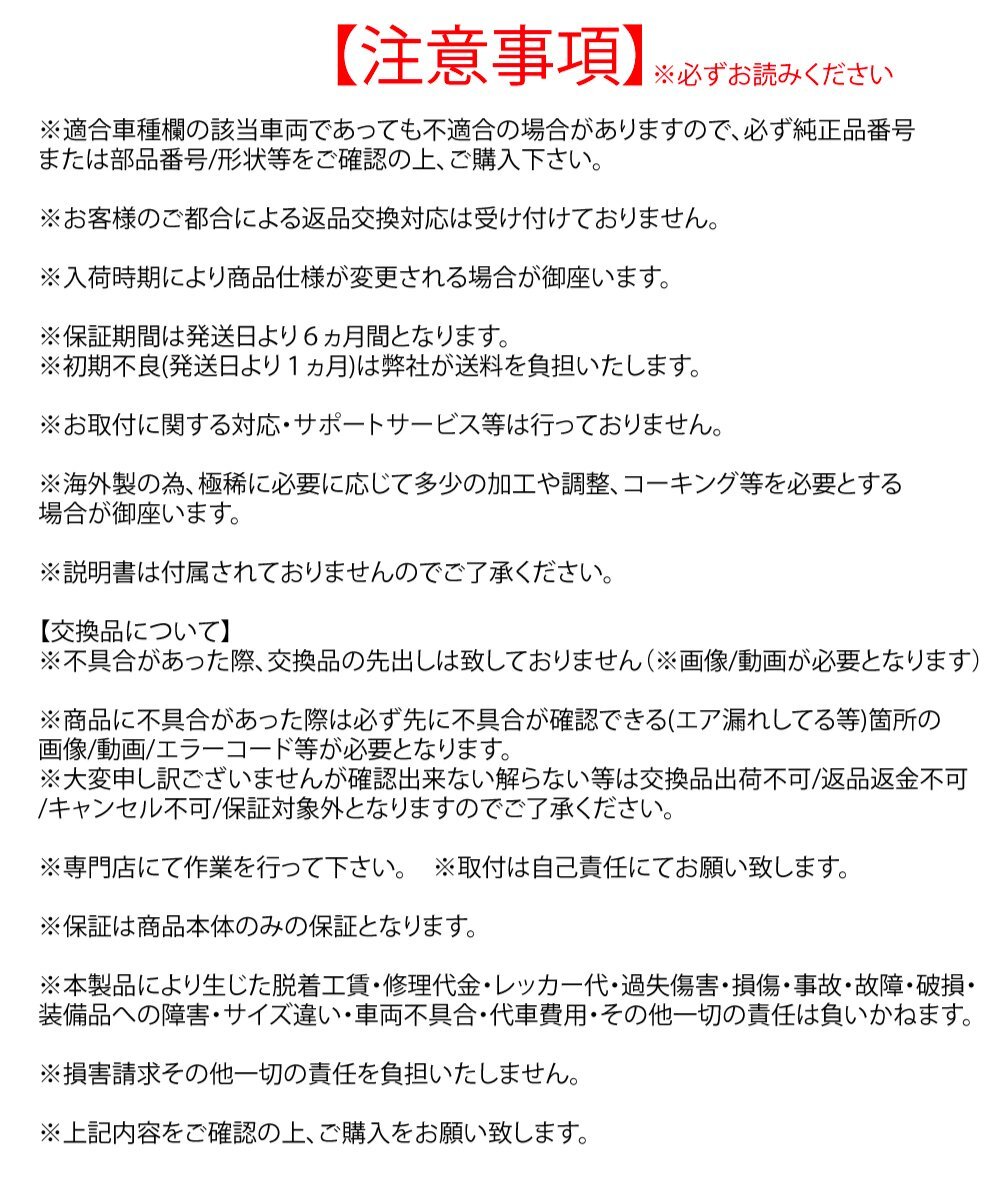 | ※注意 | ※適合車種欄の該当車両であっても不適合の場合がありますので、必ず純正品番号 又は部品番号/形状等ご確認の上、ご購入ください。 ※お客様のご都合による返品/返金/交換対応は受け付けておりません。 ※商品ごとの保証書は発行しておりませんので商品発送時の送り状伝票を保管してく ださい。 ※商品仕様が予告なく変更される場合が御座います。 ※保証期間は発送日より6ヶ月間となります。 ※初期不良のみ弊社が送料を負担致します(※発送日より1ヶ月間) ※保証の際に伴う往復送料は発送日から1ヵ月を過ぎますとお客様負担となりますの でご了承ください。 ※弊社ではお取り付けに関する対応・サポートサービス等は行なっておりません。 ※海外製ですので必要に応じてコーキング処理を必要とする場合がございます。 ※説明書は付属されておりませんのでご了承下さい。 【交換品について】 ※不具合があった際、交換品の先出しは致しておりません(※画像/動画が必要) ※商品に不具合があった際は必ず先に不具合が確認できる(エア漏れしてる等)箇所の 画像/動画/エラーコードが必要となります。 ※大変申し訳ございませんが確認出来ない解らない等は交換品出荷不可/返品返金不可 /キャンセル不可/保証対象外となりますのでご了承ください。 ※エアサス不良による焼き付きは保証対象外となります。 ※専門店にて作業を行って下さい。 ※取付は自己責任にてお願い致します。 ※保証は商品本体のみの保証となります。 ※本製品により生じた脱着工賃・修理代金・レッカー代・過失傷害・損傷・事故・故障・破損・ 装備品への障害・サイズ違い・車両不具合・代車費用・その他一切の責任は負いかねます。 ※損害請求その他一切の責任を負担致しません。 ※上記内容をご確認の上、ご購入をお願い致します。 |