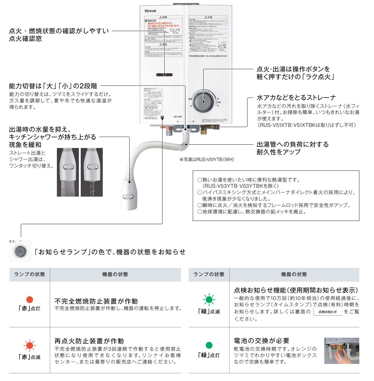 こちらは Rinnai ガス瞬間湯沸器 RUS-V51XTB(WH) です。 中古品となります。 安全装置と充実した機能で安心・快適 止水機能を追加した安全装置が充実 ・消し忘れ防止装置 点火後、約10分で自動的に消火、止水します。 ・立ち消え安全装置 立消えなどで炎が消えると自動的にガスを遮断し、止水します。 ・点火時炎検出装置 正常に着火しなかった場合、ガスを遮断し、止水します。 ・過熱防止装置 機器内部の温度が異常に高くなった場合、ガスを遮断し、止水します。 ![]() 商品詳細は、メーカーサイト RUS-V51XTBにてご確認ください。 【 コンディション 】 中古品となりますが、多少のスレ・小傷程度でさほど使用感も見られない為、状態良好なお品かと思います。 年式も中古製品としては新しく、中古でも新品に近い程度の物をお探しの方におすすめです。 引取り時、動作確認済みとなります。 この機会にいかがでしょうか。 皆様のご入札をお待ちしております! 再良市場の他のお品物はこちらから!