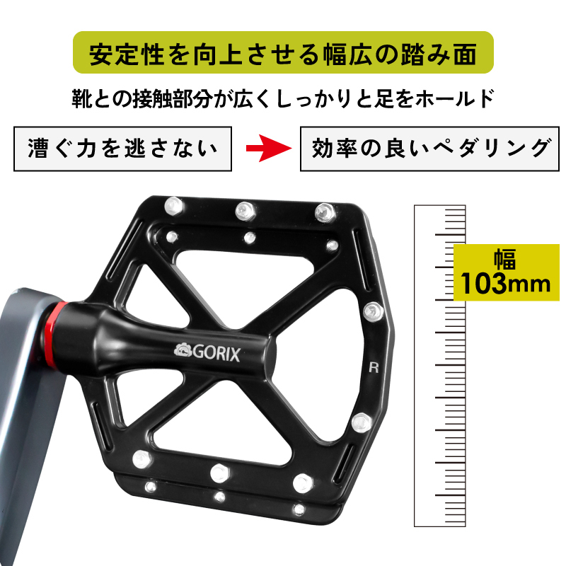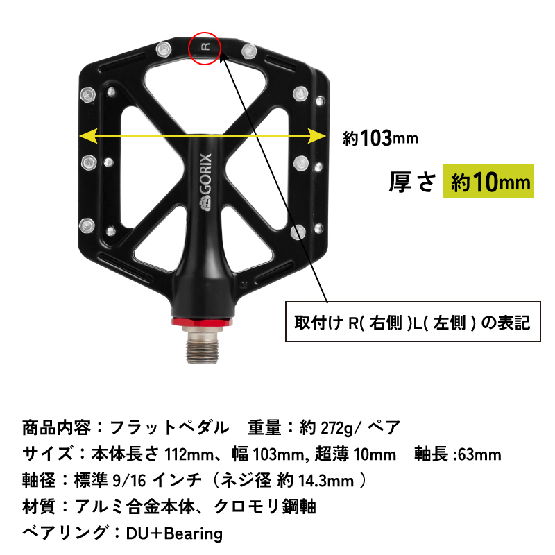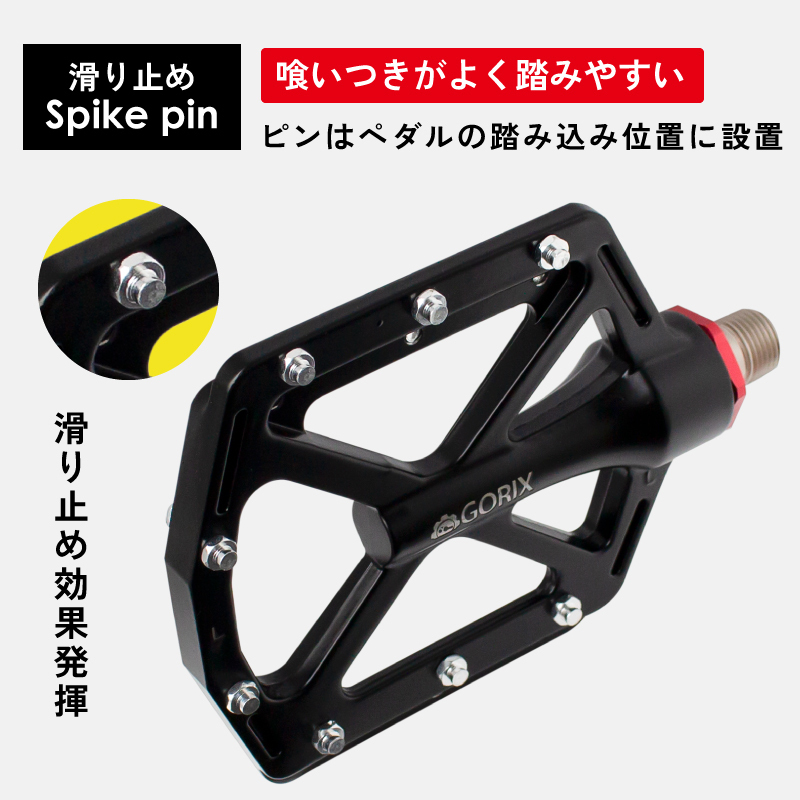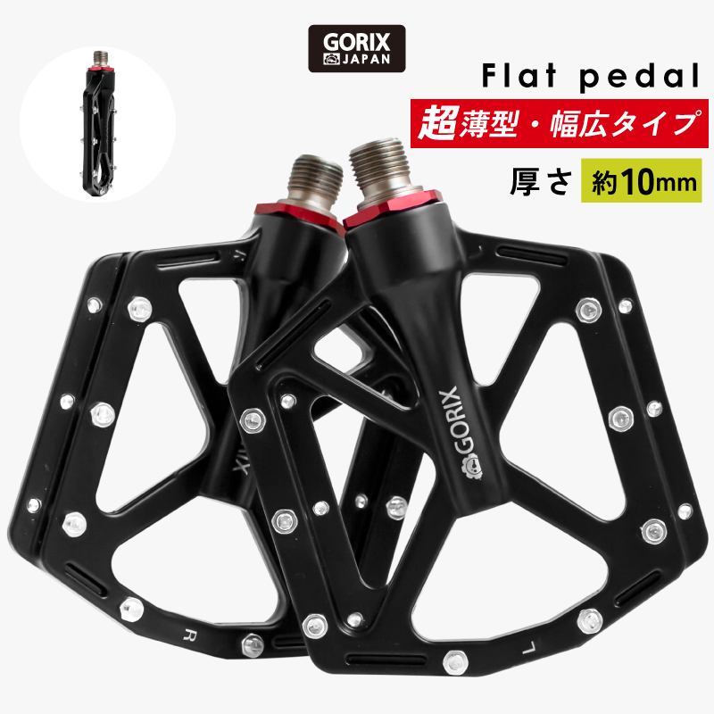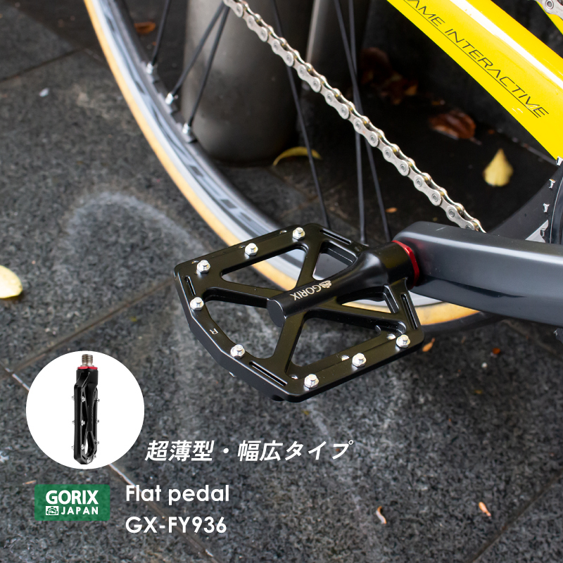 超薄型でダイレクト感が特徴のフラットペダル ワイドな踏み面なのに薄型でスマートなすっきりとしたデザイン。 クロスバイク、マウンテンバイク、ロードバイク、ミニベロ、電動自転車などに最適なマルチペダル。 通勤や街のり、ツーリングなどにも使える実用的なフラットペダルです! 大胆に肉抜き加工が施された六角形の形状。 アルミ合金で耐久性があり丈夫 踏みやすく食いつきがスパイクピンはしっかりと靴下をホールドします。 [超薄型設計] ペダルの厚さは10mm! ダイレクト感とコントロール性に優れた超薄型デザイン [踏み面は幅広] 安定性を向上させるため幅広でワイドな踏み面。 靴との接触部分が広くしっかりと足をホールドし漕ぐ力を逃さない。 しっかり体重を乗せられるので効率の良いペダリングが可能。 ペダルの安定感やグリップ力などを十分に発揮。 [滑り止めピン] 片面に8個ピンを設置し滑り止め効果を発揮します。 ピンはペダルの踏み込み位置に設置しています。 通常のピンの無いペダルより喰いつきがよく踏みやすくなります。 [軽量化の肉抜き六角形] 障害物に当たりにくくする六角形の踏面。 肉抜きする事で軽量化と汚れ防止に。 [アルミ合金] 軽量で丈夫なアルミ合金素材を採用。 耐久性に優れ耐摩耗性、耐腐食性が良い。 タフなサイクリングに最適。 [カジュアルに] 通勤・通学や街乗り、ツーリングにマルチに使える。 六角レンチで交換可能なのでペダルの取り付けも簡単に。 (※ペダル取付け時は固結防止のためグリスを塗布する事をおすすめします。) 商品内容フラットペダル 重量約272g/ペア サイズ本体長さ112mm、幅103mm, 超薄10mm 軸長63mm 軸径標準9/16インチ(ネジ径 約14.3mm ) 材質アルミ合金本体、クロモリ鋼軸 ベアリングDU+Bearing カラーブラック ・商品は入荷によりキズがある場合があります。 ・保証対象外になりますのでご了承お願い致します。 ・ディスプレイ環境により実物と色が異なる場合が有ります。 ・入荷時期により予告無く一部仕様変更する場合が有ります。 | |