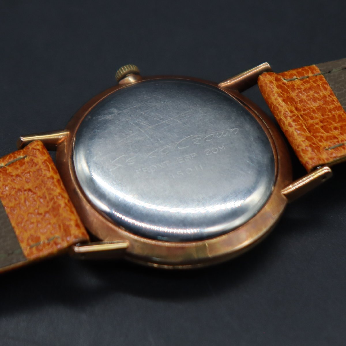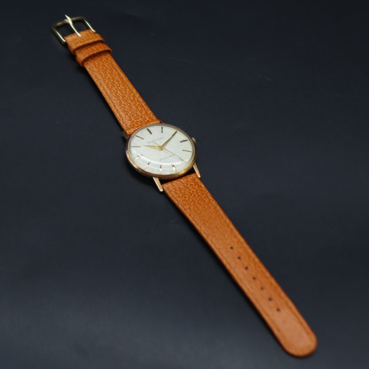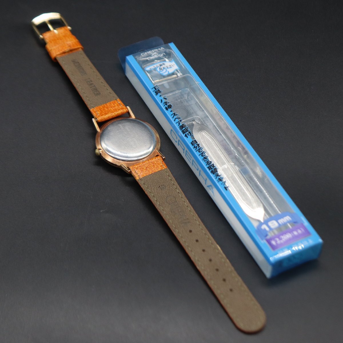 平置きで12時間動作確認済み、大幅な遅れなく稼働中です。 リューズ巻止まりOK、一段引きで時間調整可能です。 ※アンティーク時計を長くお使いいただくため、 丁寧に、やさしく操作していただくようお願いいたします。 全体に経年のキズ・金メッキに小剥がれや汚れ、 文字盤に所々うすいシミやは汚れが見受けられますが 風防の視認性は十分に保たれており、 針やインデックスは比較的傷み少なく、良い状態です。 筆記体ロゴや印字プリントもかすれなく鮮明です。 アンティーク感があり、大変良い雰囲気のお品です。 リューズ摩耗しておりますが、巻き上げ良好です。 裏蓋、ややうっすらしておりますが刻印残っております。 ベルトは、新品の国内メーカー製革ベルトに交換済みですので すぐにお使い頂けます。 古いお品物ですので、詳しくは画像にてご判断願います。 |