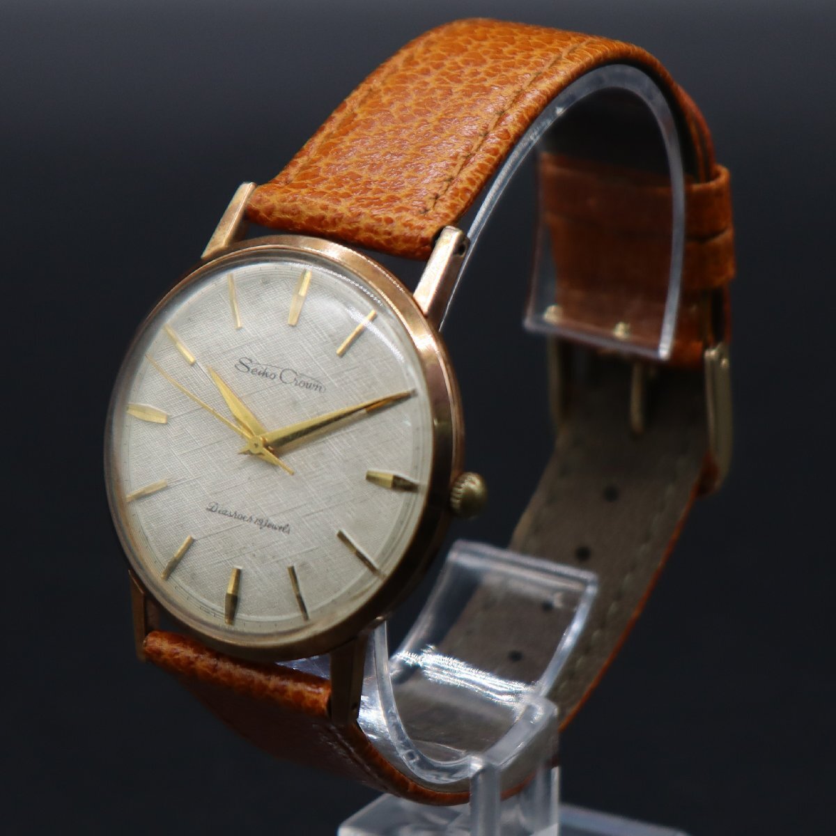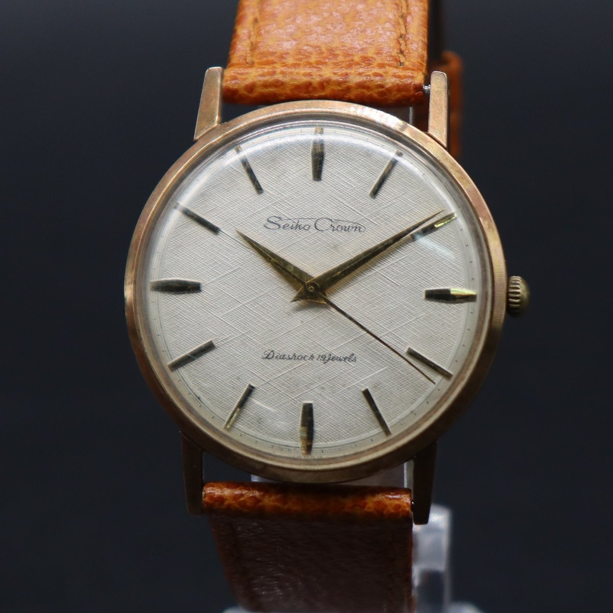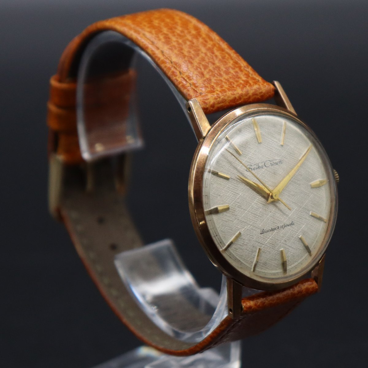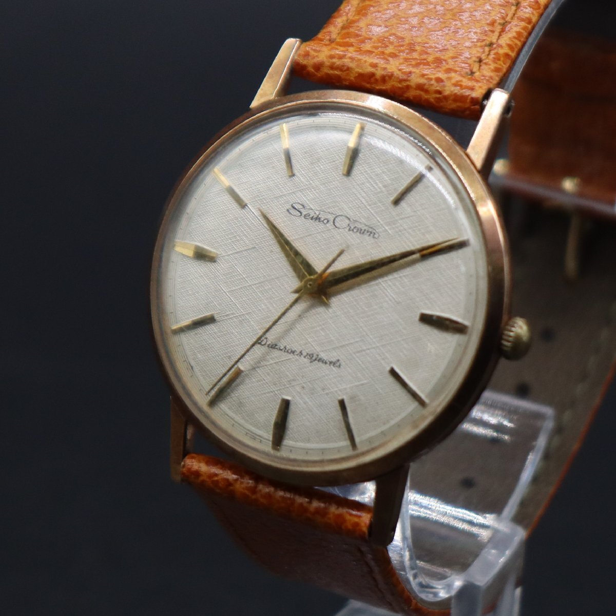 平置きで12時間動作確認済み、大幅な遅れなく稼働中です。 リューズ巻止まりOK、一段引きで時間調整可能です。 ※アンティーク時計を長くお使いいただくため、 丁寧に、やさしく操作していただくようお願いいたします。 全体に経年のキズ・金メッキに小剥がれや汚れ、 文字盤に所々うすいシミやは汚れが見受けられますが 風防の視認性は十分に保たれており、 針やインデックスは比較的傷み少なく、良い状態です。 筆記体ロゴや印字プリントもかすれなく鮮明です。 アンティーク感があり、大変良い雰囲気のお品です。 リューズ摩耗しておりますが、巻き上げ良好です。 裏蓋、ややうっすらしておりますが刻印残っております。 ベルトは、新品の国内メーカー製革ベルトに交換済みですので すぐにお使い頂けます。 古いお品物ですので、詳しくは画像にてご判断願います。 |