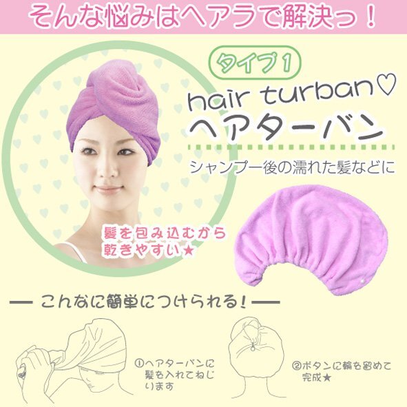 | ●マイクロファイバーで簡単ドライ!!髪につけておくだけで、水分を吸収。 |