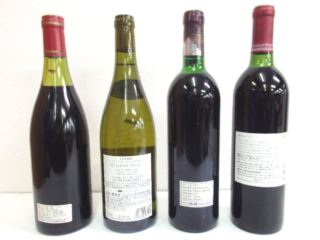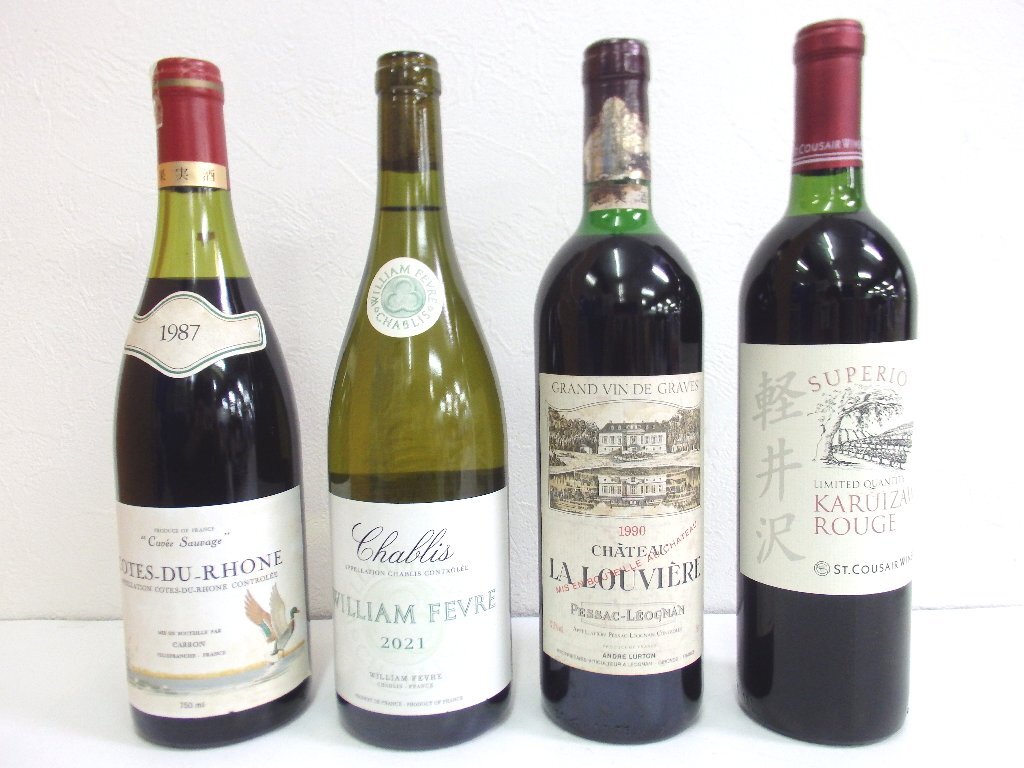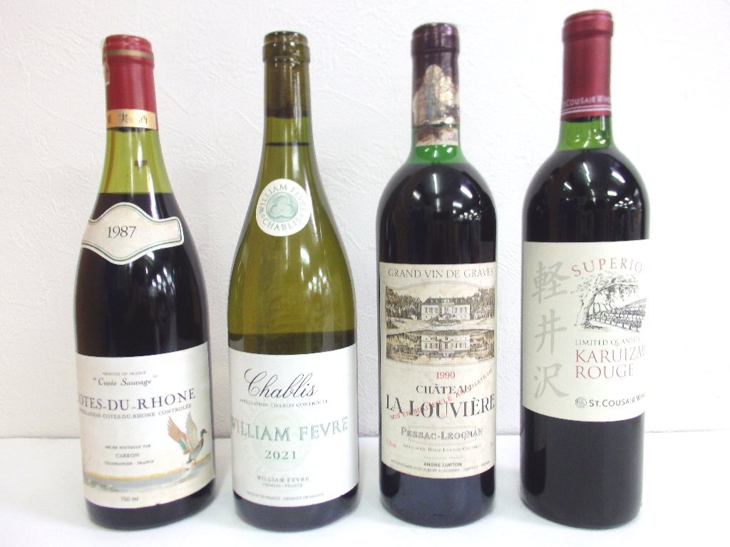 | 内容 | ・COTES DU RHONE CARRON 1987 750ml 14%未満/ラベル汚れ/ボトル表面汚れ/液面低下/澱多あり/キャップフィルム少し劣化と汚れ/漏れ跡のような汚れあり ・ウィリアム フェーブル シャブリ 2021 750ml 12.5%/ラベル少し汚れ/キャップフィルム無し ・シャトー ラ ルーヴィエール 1990 750ml 12.5%/ラベル汚れ/ボトル表面汚れ/品質不明/液面低下/漏れ跡あり/キャップフィルムダメージ ・軽井沢ルージュ 750ml 15%未満/ラベル少し汚れ/ボトル表面少し汚れ/澱多あり/キャップフィルム少し汚れ |