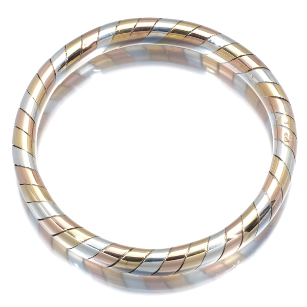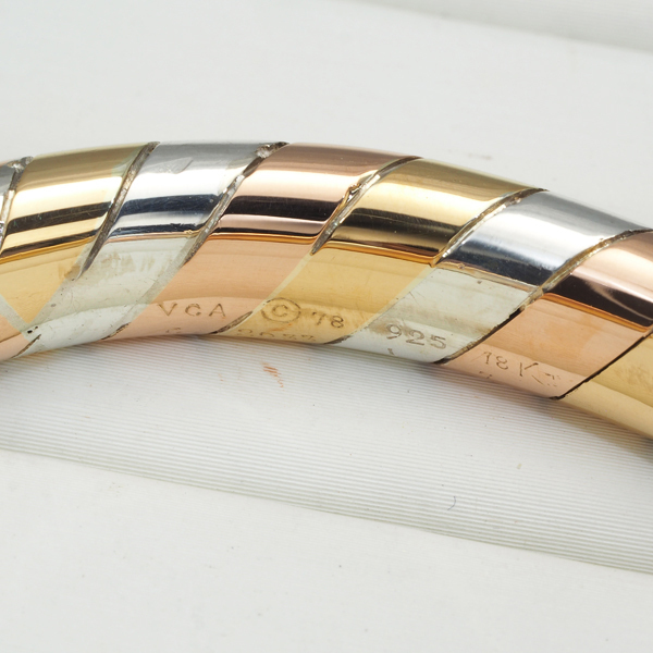重厚な創りに輝くスリーカラーの美しい光沢と存在感溢れるボリュームが目を引く ヴァンクリーフ&アーペルの貴重な逸品ジュエリー。装いのお手元に贅沢な輝きをご堪能ください。 |