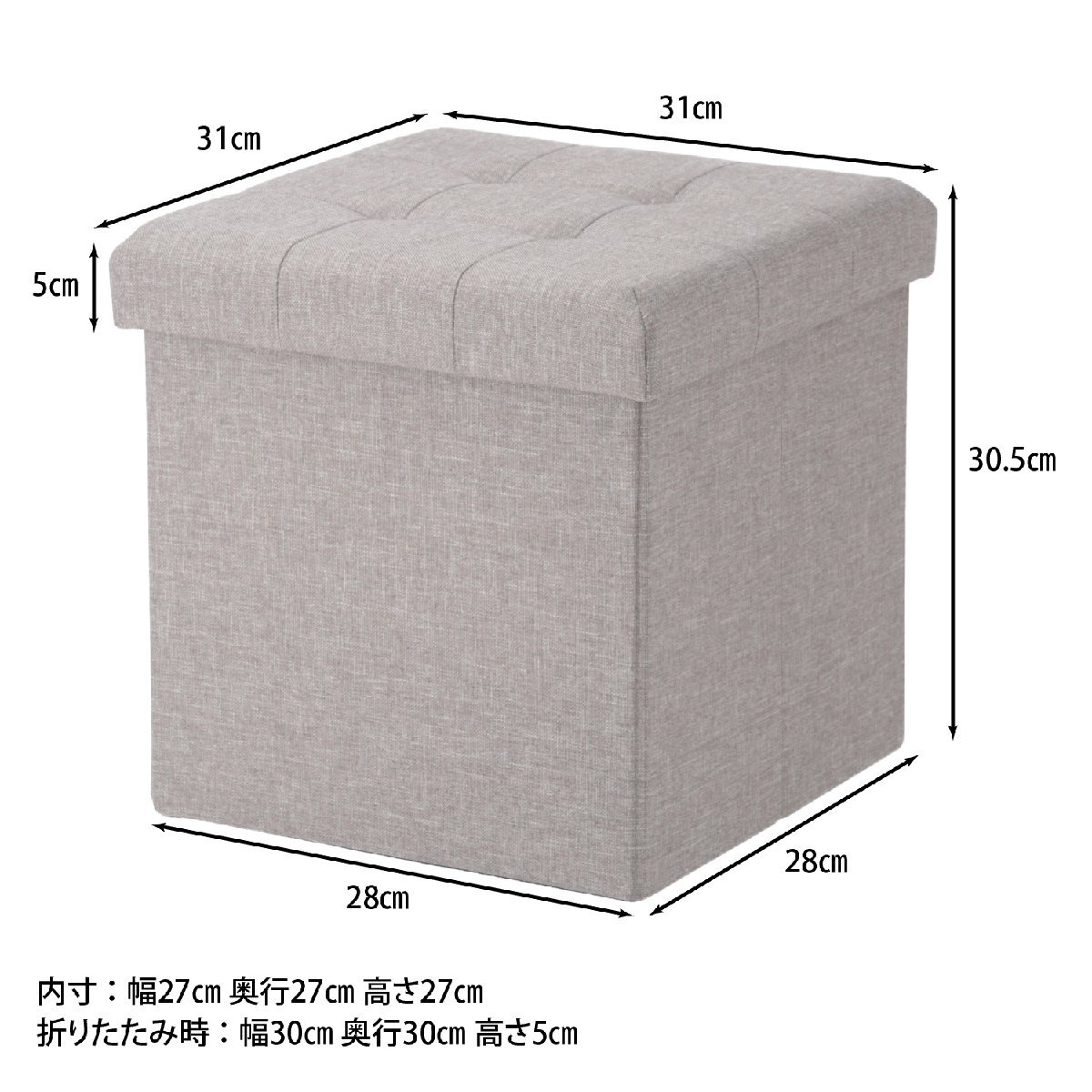 | サイズ | 全体:幅310 × 奥行310 × 高さ305mm 座面高:305mm 耐荷重(座面):80kg 内寸:270x270x270mm 座面ウレタン厚:15mm MDF厚(蓋):4.75mm MDF厚(本体):2.5mm MDF厚(底板):2.0mm ※サイズ詳細はサイズ画像をご参照ください。 |