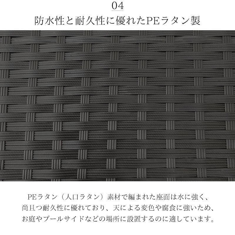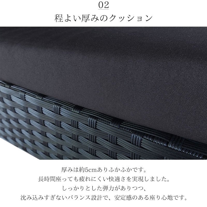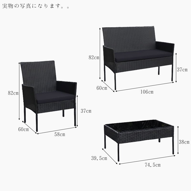 ![]() ラタン調のデザインが施された高級感のある ガーデンテーブル&チェアの4点セット。 自宅のお庭や店頭のカフェスペース、アウトドアシーンなどにおすすめの一品です。 水に強いPEラタン(人工ラタン)で編まれている為、雨による腐食や変色に強く、 天然素材に比べて頑丈製や耐候性に優れており、 水が染み込まず、汚れてしまった時も簡単にお手入れが出来ます。 天板には高級感を演出するガラス天板を採用。 ガラス部分は頑丈な強化ガラスが使われている為、破損しにくく長持ちします。 座面部分は適度に沈み込む為、クッションを使用していなくても心地よく座れます。 芝や植物の並んだ庭先や、スッキリとしたテラス、プールサイド、アウトドアシーン等を豪華に演出致します。 ゆったりとくつろぎやすいチェアで、休日には優雅なひと時を送ってみてはいかがでしょうか? ■こんな方におすすめ ベランダやバルコニーにおしゃれなガーデンチェアセットを置きたい ガーデンソファやガーデンテーブルでアウトドアリビングを楽しみたい テラスやウッドデッキで家族や友人とゆったり過ごしたい シンプルでモダンな屋外用ガーデンファニチャーを探している ■商品詳細 セット内容:4点(ローテーブル×1、アームチェア×2、ベンチ×1) カラー:ブラック ●材質● スチール、ポリエチレン、強化ガラス、クッション(表地・中材):ポリエステル サイズ(約): ベンチ:横幅106cm、高さ82cm、奥行き60cm チェア:横幅58cm、高さ82cm、奥行き60cm テーブル:横幅74.5cm、高さ38cm、奥行き39.5cm 重量(約):ベンチ:8kg、チェア:5.6kg、テーブル:6.8kg 耐荷重(約):チェア:80kg、ベンチ:150kg、テーブル:20kg ※英文説明書が付属しております。 ※こちらの商品は、屋外使用を目的として作られています。 直射日光による日焼け、雨ざらしによる劣化といったケースによる 商品自体の経年劣化は避けられません。 梅雨期間や使用しない際には、屋内保管を推奨いたします。 ※直射日光や風雨による錆や退色が出ます。 定期的にサビ防止スプレー等のメンテナンスをお勧め致します。 ※販売専門になりますので、組立設置などのサポートは行っておりません。 以上をご理解の上でのご購入をお願い致します。 |