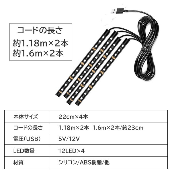 USBタイプの自動車用フロアライトの出品です。 こちらのページはホワイトの商品になります。 4本で1セットになります 1本に12LEDを搭載 インテリアのカスタムにはかかせないロマンチックな室内空間を作り出すLEDテープ 車内をおしゃれに照らしてくれます 雰囲気がガラリと変わるのでオススメですよ 足元のみならずダッシュボードやサイドにつけてもおしゃれですね |