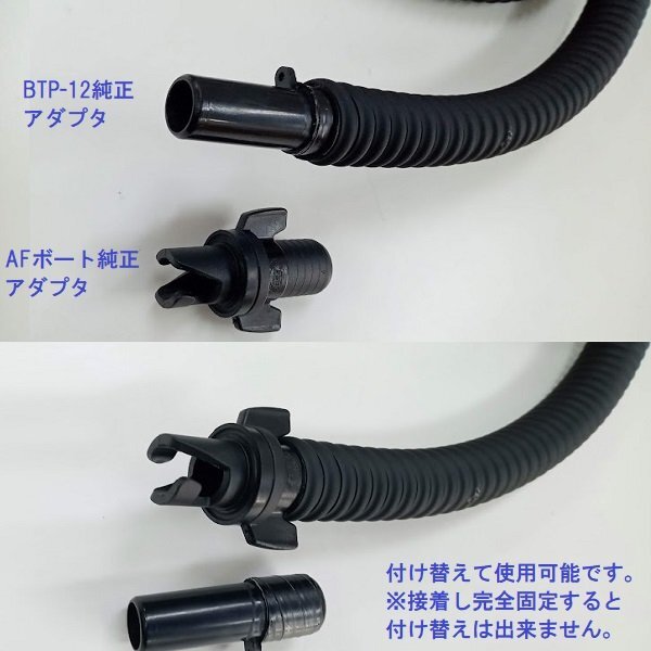 ボートやドーリーの詳細画像はこちらをクリックしてください ボート用品の詳細はこちら ◇◆BTP-12 詳細・スペック◆◇ ◆最大圧力:1.0b(バール) ◆DC :12V ◆重量:1.9キロ ◆サイズ100×290×150mm ◆装備品:ポンプ本体・専用キャリングケース・ホース・AFボート専用アダプタ・アダプターセット 1番~8番(7番を除く)・取り扱い説明書 ●BTP-12用 リチウムイオンバッテリー6.6Ah 詳細・スペック ●PSE取得 ●オン・オフスイッチ付き ●過電流保護/ショート保護機能付き ●サイズ:W113×D128×51mm ●使用温度範囲:-10℃~60℃ ●充電時温度範囲:-10℃~45℃ ※水中での使用はできません。水没させないで下さい。 ※低温状態で大容量機器を使用すると動作が不安定になる場合があります。 ◇◆特 徴◆◇ ●リチウムイオンバッテリーとAFボート専用のアダプタが出荷時よりセットされた商品 ●このポンプは、ダイヤルゲージ式で初めに空気圧を設定します。低圧から始まり、自動で高圧コンプレッサーに切り替わり、その後設定した圧力になりますと自動で停止します。 ●性能は1000hpaでほとんどのインフレータブルボート、エアフロアの充気が可能となります。 ●故障率も低い為お勧めのポンプです。 ●排気も可能ですからボートの収納時にはボートをペチャンコにできます。 ●電源はリチウムイオンバッテリーで、ボートの充気だけでなく、電動リールの使用や魚探の使用も可能にします ●高価なポンプですが大変重宝します。 ●アダプタを付け替えればAFボート以外のゴムボートも簡単に膨らませることができます。 | ||||