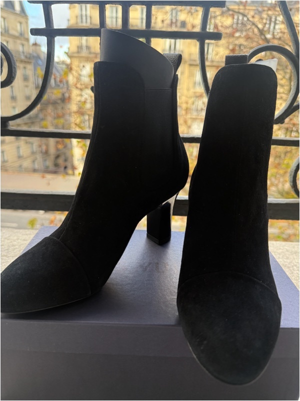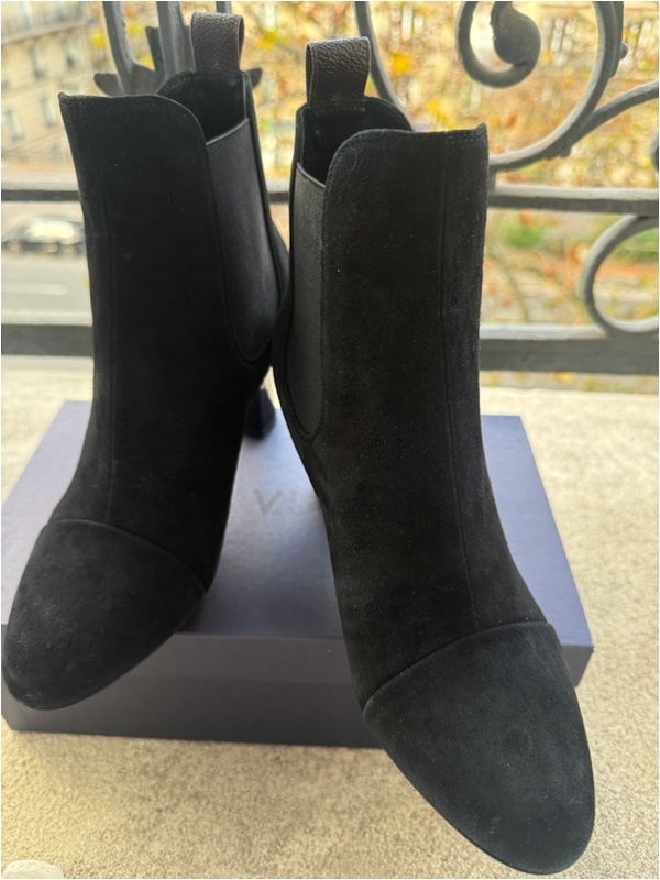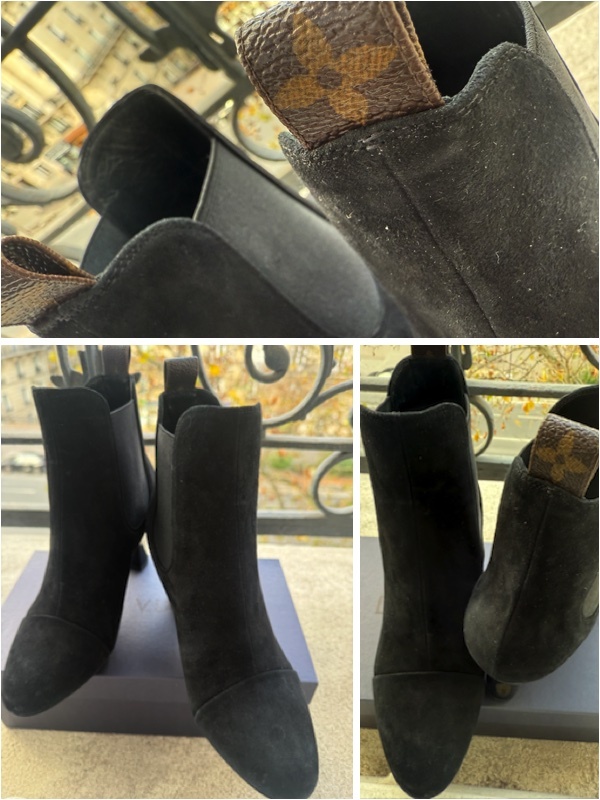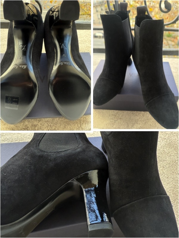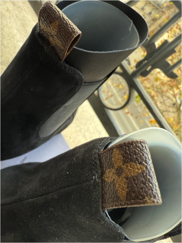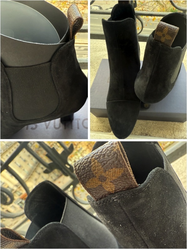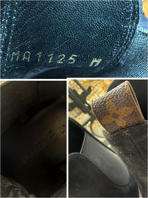 フランス ルイ・ヴィトン LouisVuitton本店の2023年の制服に採用されたブーツです。 支給されて着用していないので未使用とさせていただきます。 サイズは37サイズ 日本サイズで23.5cm〜24cmほど。後ろのプルタブがモノグラム柄のレア物です。 モノグラムの刻印が入っているのでヴィトンとすぐにわかります。 また履きやすいようにサイドがゴムになっています。 サイズ:37 ハイヒールの高さ7.5cm 。 |