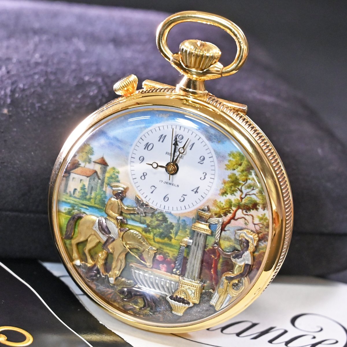 リュージュのロマンス オートマタ オルゴール付ポケットウォッチです。 オルゴールと単面の自動人形付レピーヌ・ポケット・ウォッチ。 機械式手巻ムーブメントのオルゴール アラーム。 音色に合わせて、文字盤・裏面のキャラクターが実際に稼働します。 表面のみのオートマタではなく、表面裏面両面がオートマタとなった最上位機種でもあります。 市場流通量の圧倒的に少ないモデルなのでお探しの方も非常に多いかと思います。 ※基本動作確認済。 |