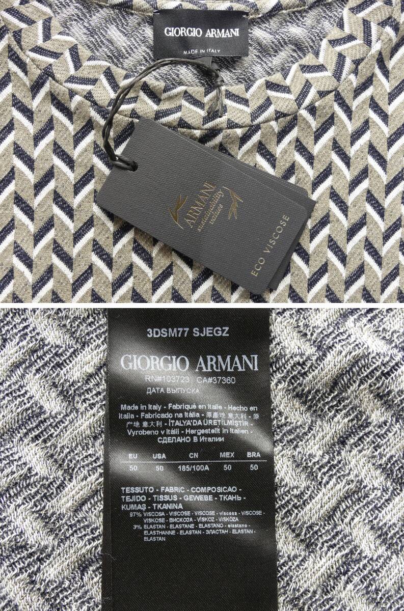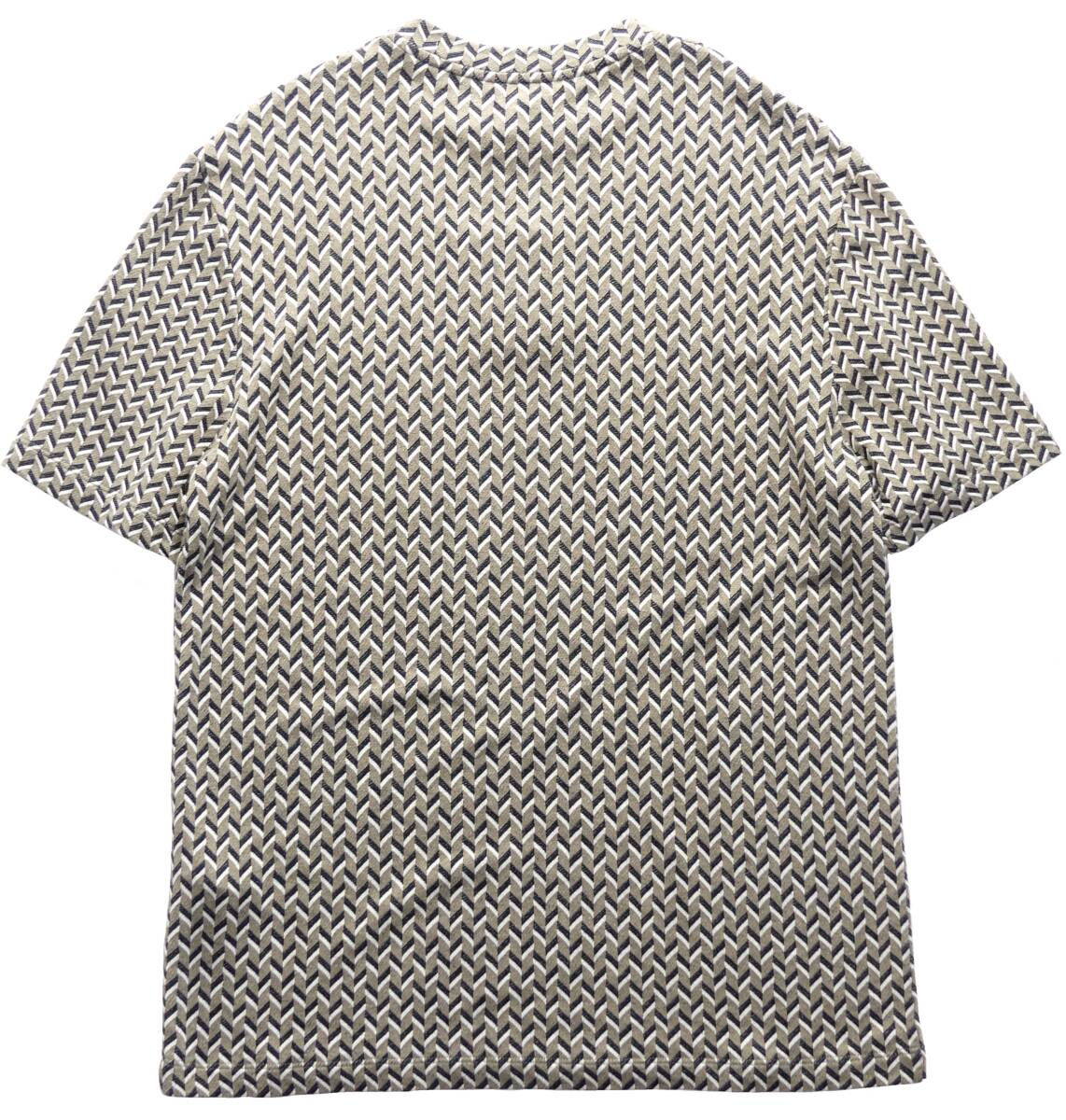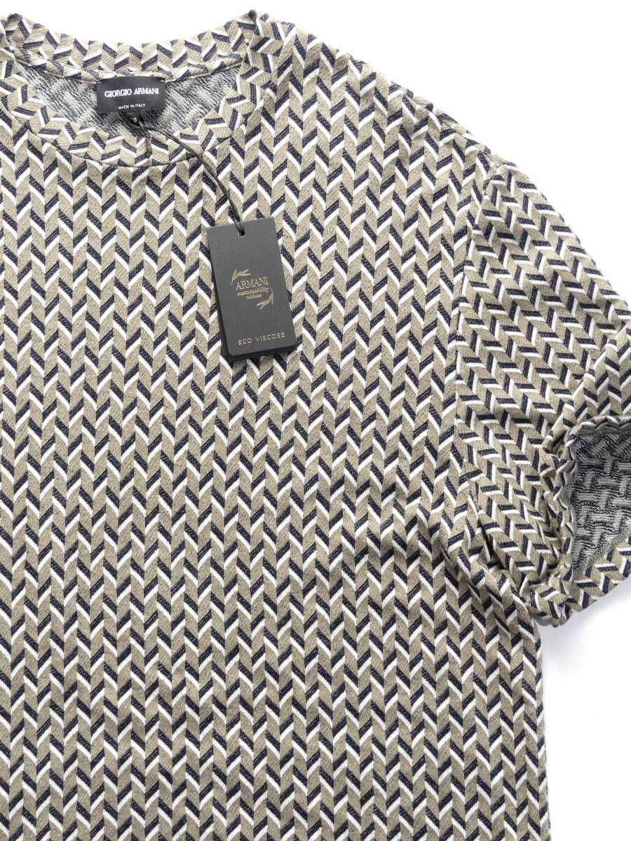 ふっくら厚手ニットジャージのTシャツ。裏側がタオル生地のようなパイル状のニット地で、引っ張れば引っ張るだけ伸びるスーパーストレッチ。洒落た幾何学柄がジャケットやアウターの胸元にバッチリ映える秋冬向けTシャツです。基本的には季節を問わない通年物として使えますが、しっかりしたニット地ですので夏場の着用は実質厳しいでしょう。秋冬シーズンに厚手アウターのインナーに着るTシャツという感じでしょうか。裕福層っぽい欧米人がレストランでアウターを脱いだらTシャツっていうシチュエーションがありますが、そんな感じで着用する秋冬向けのTシャツになると思います。実際のところ日本でも商業施設に入ればセーターではちょっと暑い時がありますから、アウターが厚手ならインナーはニットTシャツでも問題が無い場合も多いです。着用時期やTPOはあまり気にせず着ていただければと思います。このTシャツは木材パルプの天然原料から作られるビスコース主体。天然由来のため土中、水中で微生物により分解されますので環境負荷の少ない素材として評価されています。アルマーニは環境破壊の無い持続性のある木材パルプだけを使用することで、自然に地球に配慮したビスコース製品を生産しています。アルマーニのエコプロダクトは他の追従を許さないレベルの業界最強トップ水準です。