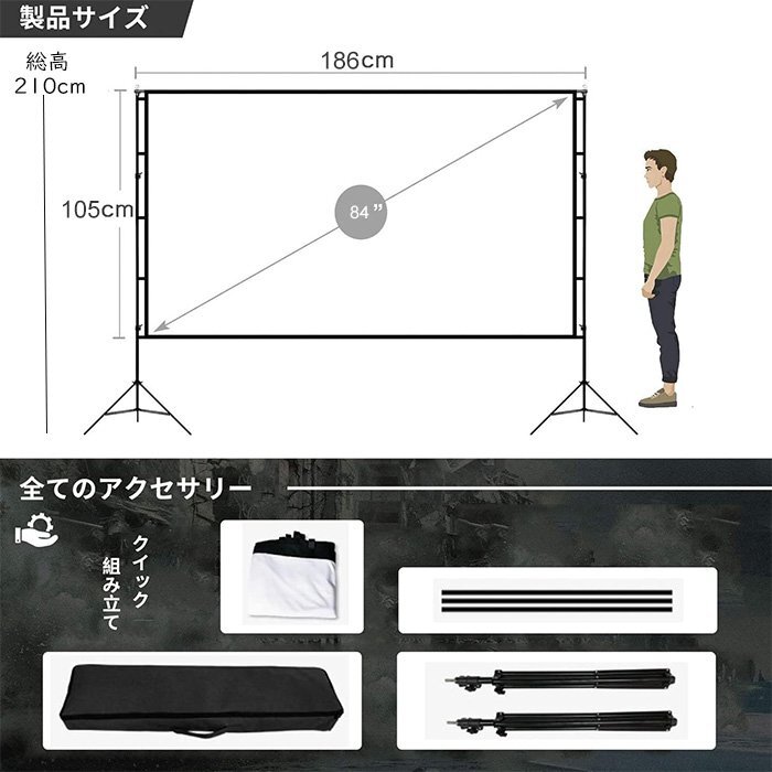 【シワになりにくい屋外映画スクリーン】対角84インチ、広視野角160°、アスペクト比1.1、16:9、ブラケット付き84インチ屋外プロジェクションスクリーンは、通常よりも太い高品質のポリエステル繊維で作られています。完成しました。画面。折りたたみ式のムービースクリーンにより、画像の鮮明さと明るさが大幅に向上します。画面は柔らかく滑らかで、より面白く、かび臭さが少なく、前面と背面の投影をサポートしています。| 出价者 | 信用 | 价格 | 时间 |